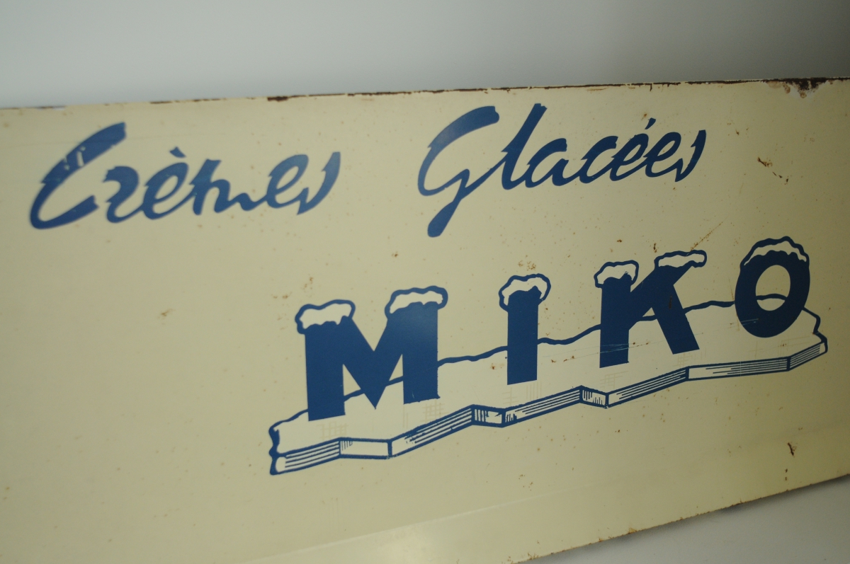 Très belle plaque publicitaire vintage, datant des années 50, pour la marque MIKO Crèmes Glacées. Une très belle patine accompagnée de marques résiduelles d'une vie bien remplie lui donnent un charme fou.