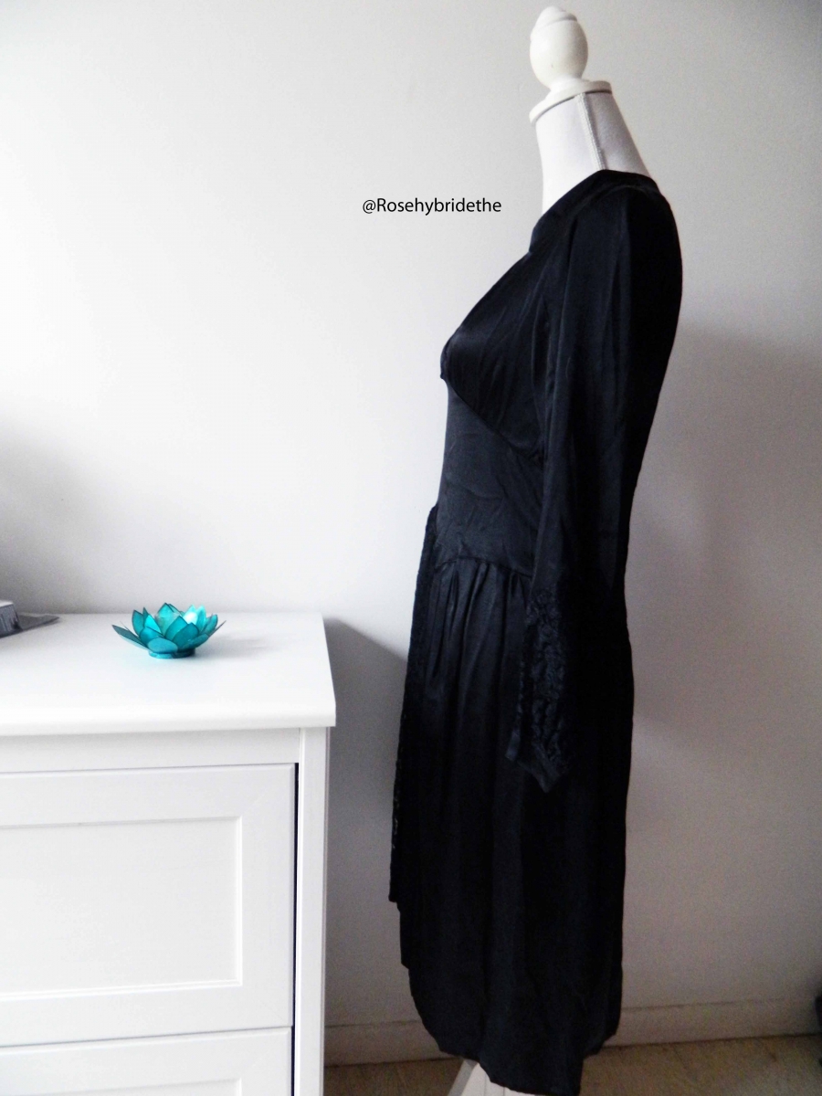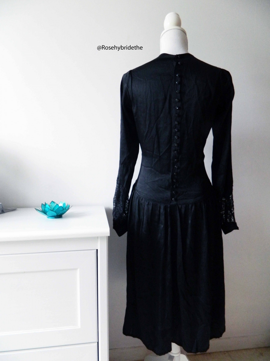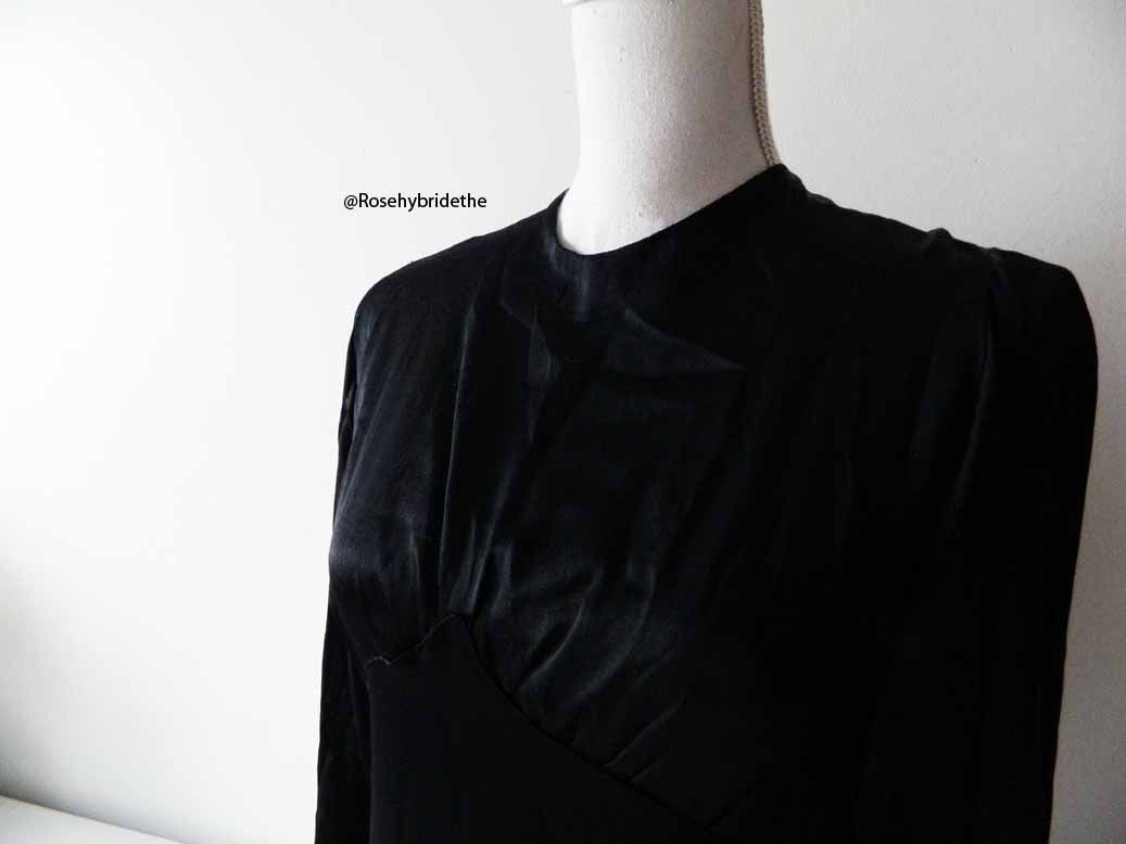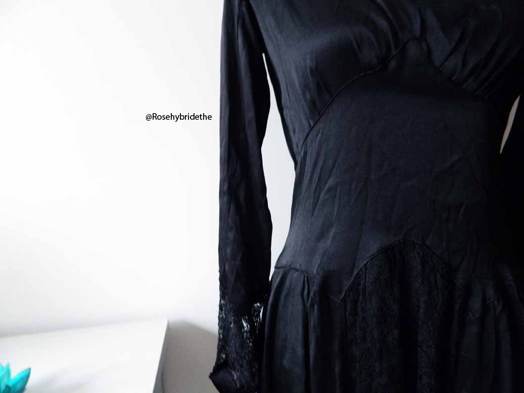 Sublime robe en satin noir cousue main, datant des années 1930.