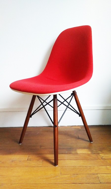 Fauteuil du designer Eames en fibre de verre et tissu rouge datant de fin 1960 estampillé Herman Miller - Mobilier International