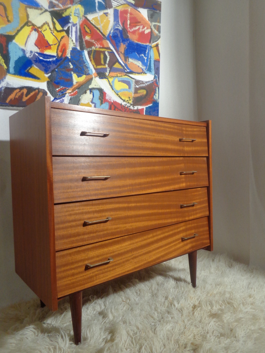 Petit prix et parfait état pour cette jolie commode couleur teck. Perchée sur de jolis pieds coniques cette ravissante commode vintage des années 60 a une allure légère et très chic. Quatre tiroirs intérieur impeccable en strie munis de jolies poignées doré pour un rangement maximum En très bon état elle s'intégrera dans n'importe quelle pièce de votre maison et attend une nouvelle vie
