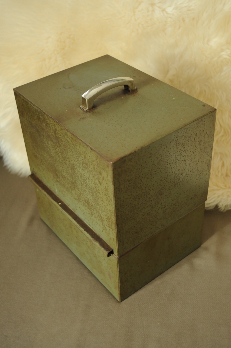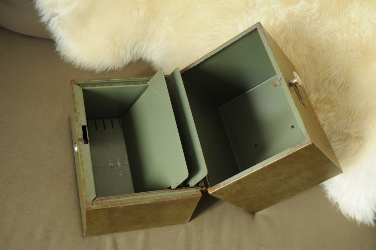 Ce joli objet est vendu avec ses clefs d'origines et deux séparateurs en acier. La serrure fonctionne parfaitement et l'ensemble présente bien. A votre convenance de le garder dans son état original ou de le brosser pour obtenir un aspect brut.