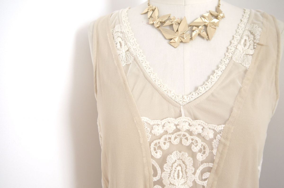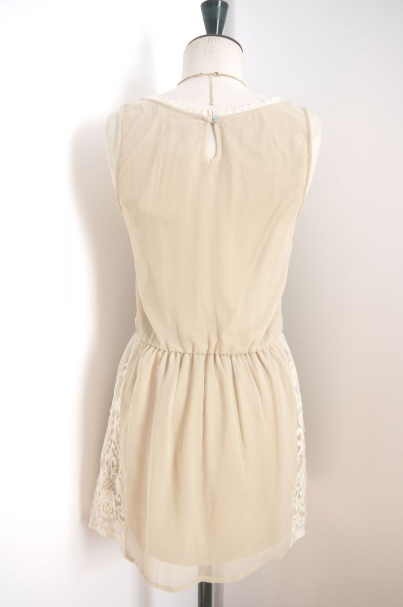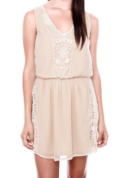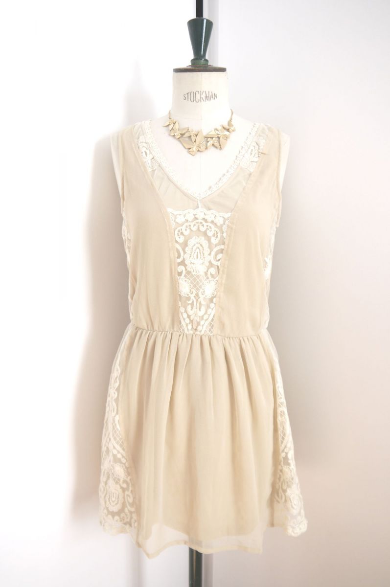 Magnifique robe de couleur beige avec des empiècements en dentelle blanche devant et sur les côtés ! Non transparente car doublée. Sans manche, col v, ouverture en goutte d'eau au dos, élastique à la taille. Marque : Pull and Bear. Neuve avec étiquette, inscrit taille M.