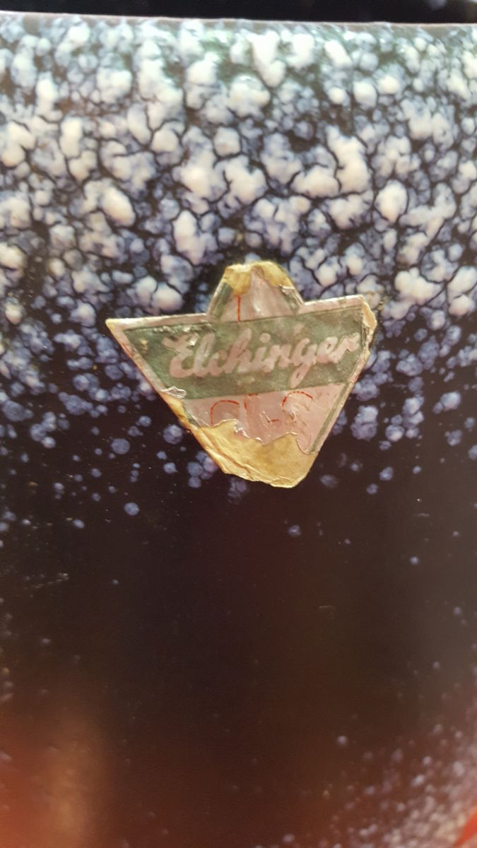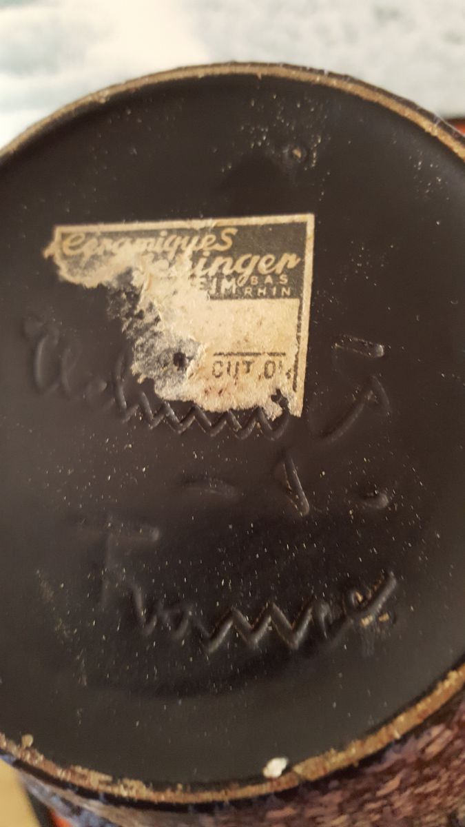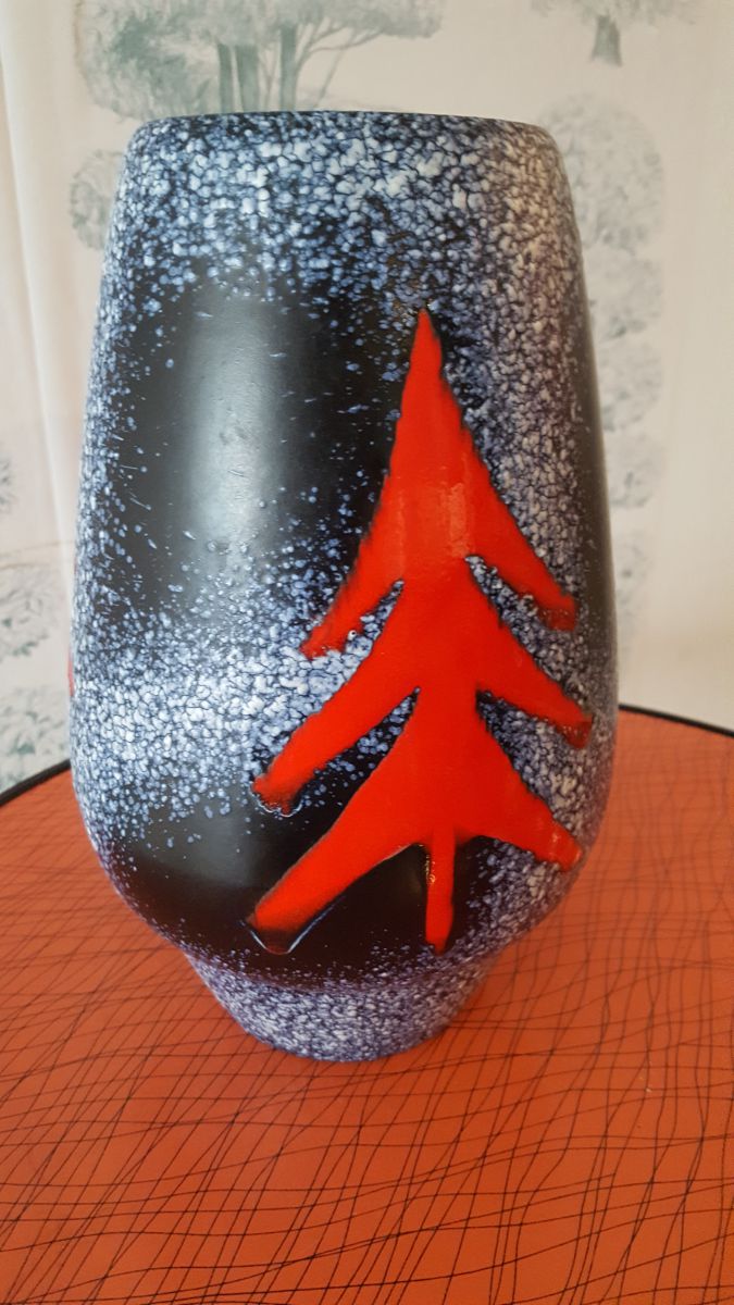 vase année 60 signé,possède encore ses deux étiquettes .émaillé rouge sur fond noir et bleu, en parfait état .