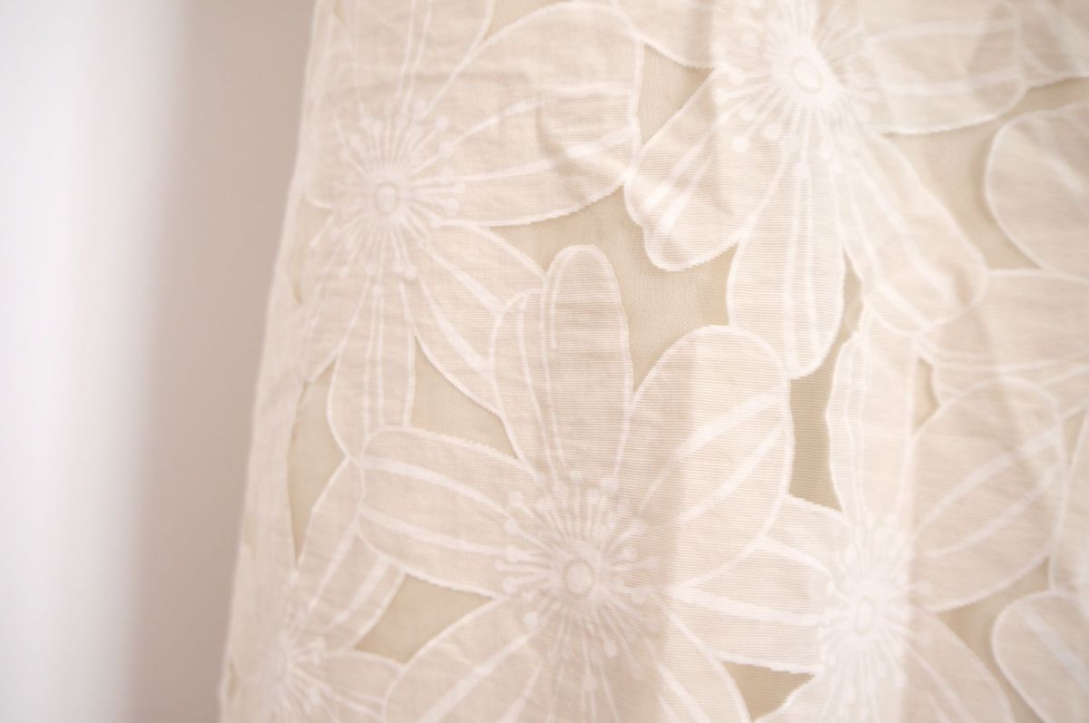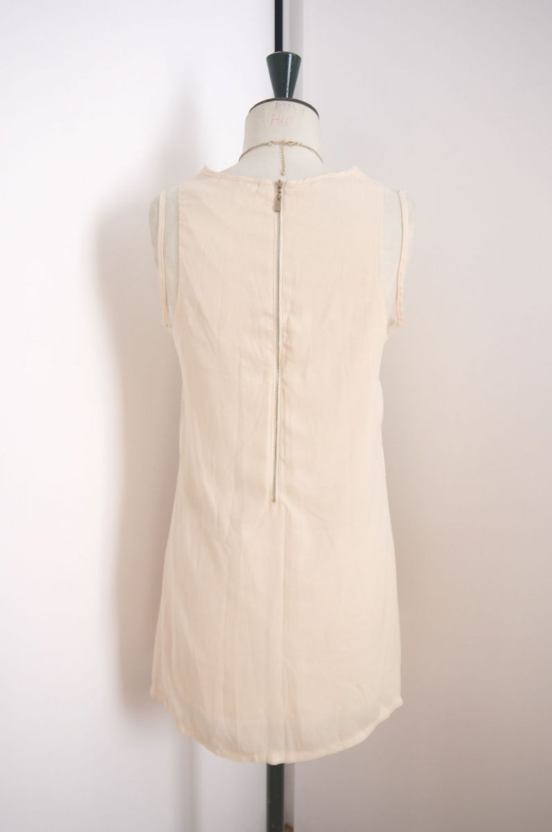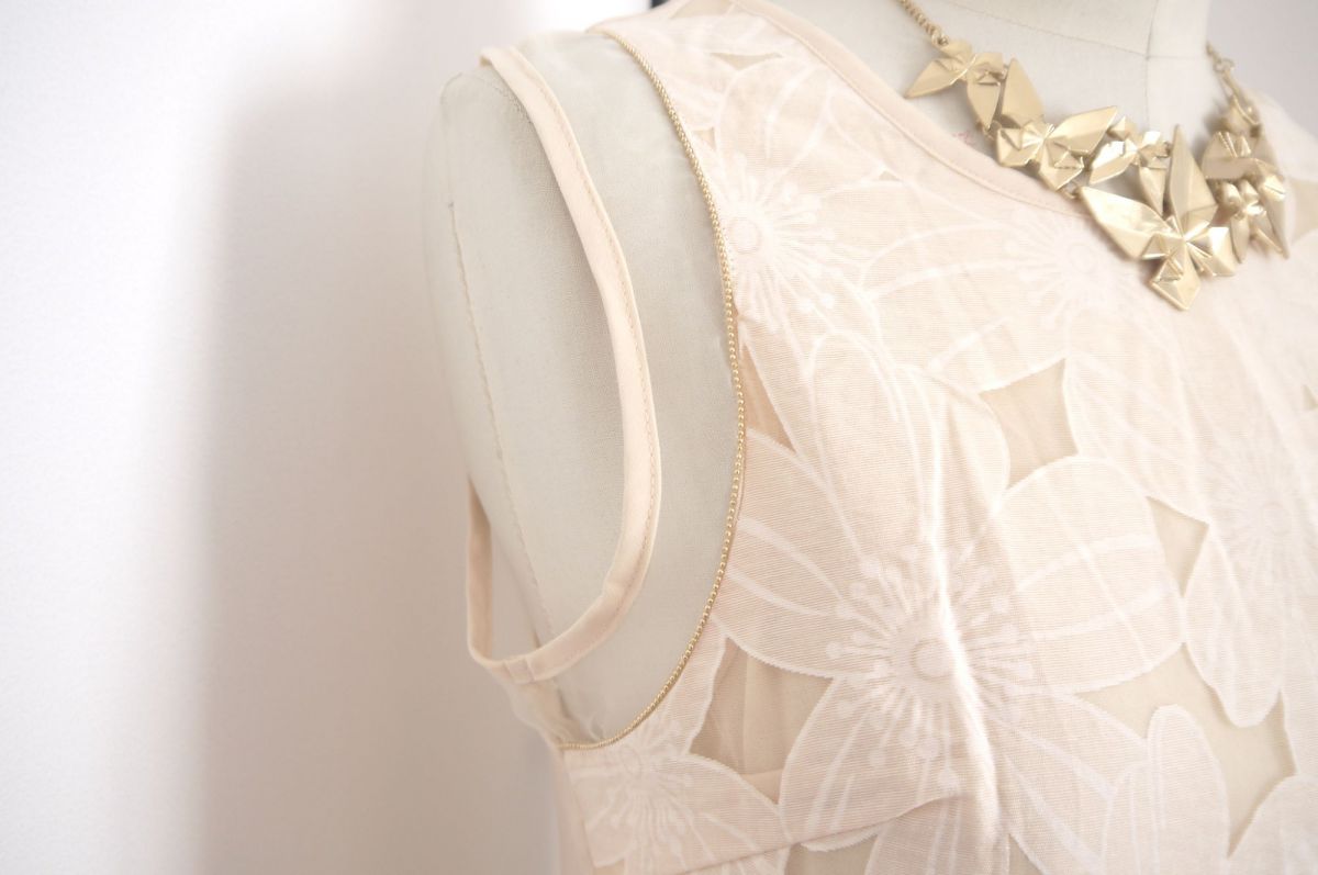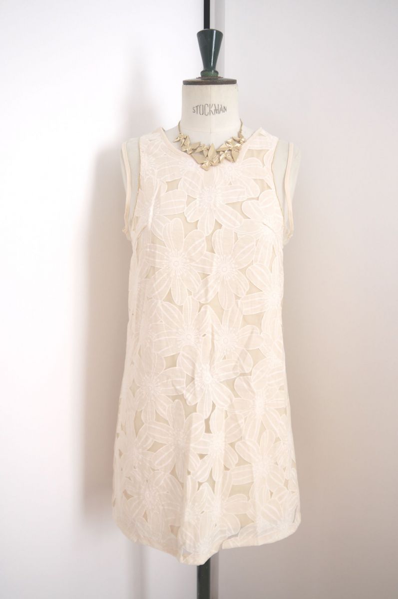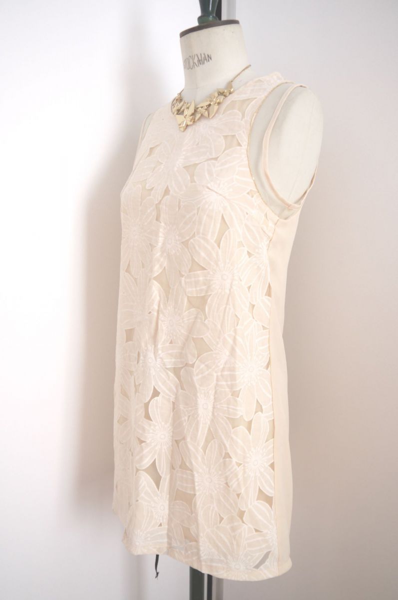 Magnifique robe droite de couleur crème de la marque Softy. Motif fleur, comporte une doublure de couleur beige, sans manche, jeu de transparence, col rond, zip au dos. Idéale pour une tenue décontractée ou chic ! Neuve avec étiquette, inscrit taille S, peut convenir à un M également.