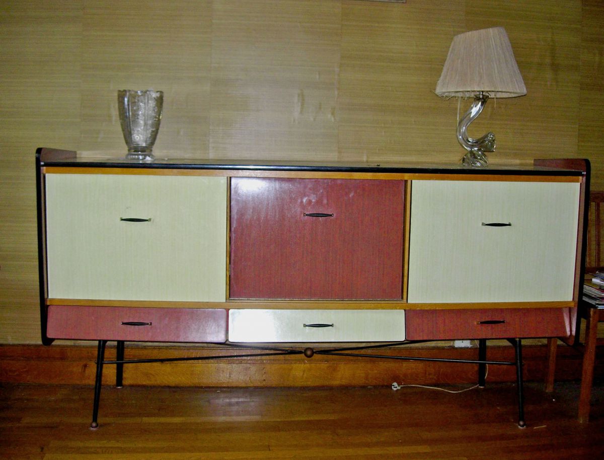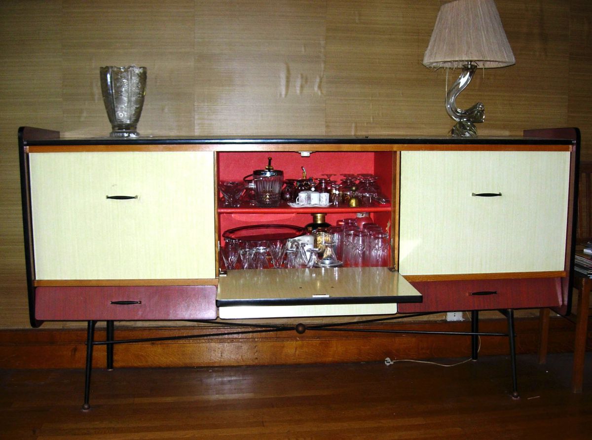 2 portes coulissantes, un abattant ouvrant sur le bar, 3 tiroirs les pieds en fer noirs
