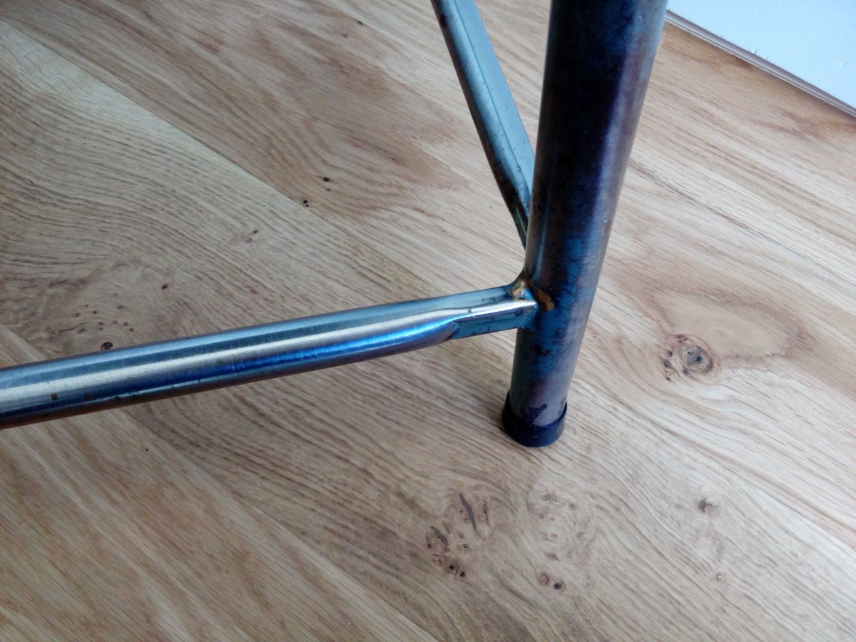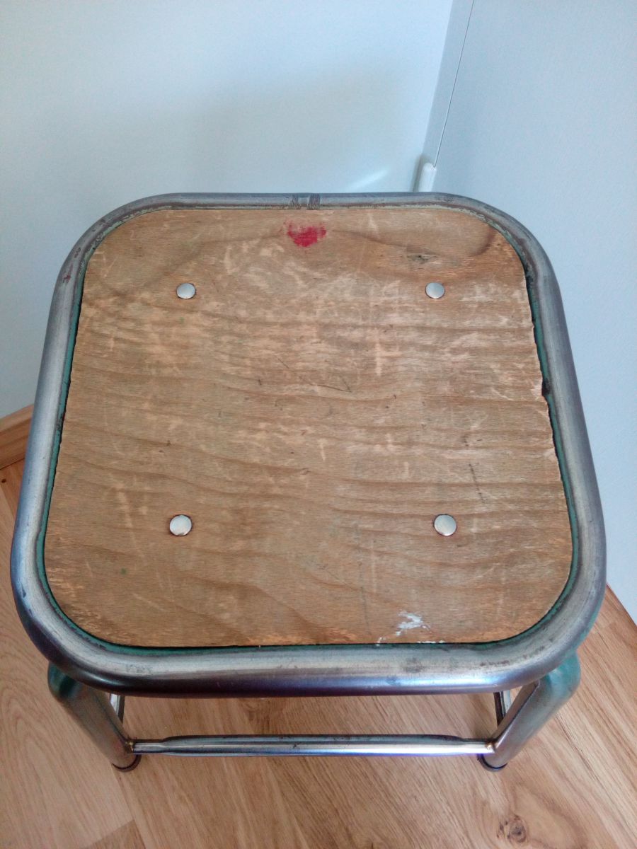Ce joli tabouret d'école (Mullca ? sans certitude aucune) est un mélange de vintage avec cette jolie couleur bleu vert tellement typique (souvenirs d'école des années 50 ou 60), et d'industriel avec son piétement tubulaire en acier et son assise en bois. Ce tabouret est en bon état général (stable, pas de souci de solidité) mais dans son jus : je vous laisse le plaisir de décider ce que vous allez en faire. Il présente les marques et l'usure de son âge et de son utilisation par des écoliers: - taches d'encres ou de peinture, rayures et griffures sur le bois. - sur le piétement, la couleur bleu vert est encore bien visible sur les montants verticaux, mais a presque entièrement disparue des tubes horizontaux, laissant un acier gris brun patiné sur le pourtour du siège et un acier brillant, poli par les pieds des écoliers sur les barres horizontales basses. Il est muni de 4 patins en caoutchouc (d'origine je pense). Il mesure 45 cm de haut, l'assise mesure 31 cm sur 31 cm. Et 40 cm par 40 cm au niveau du piétement.