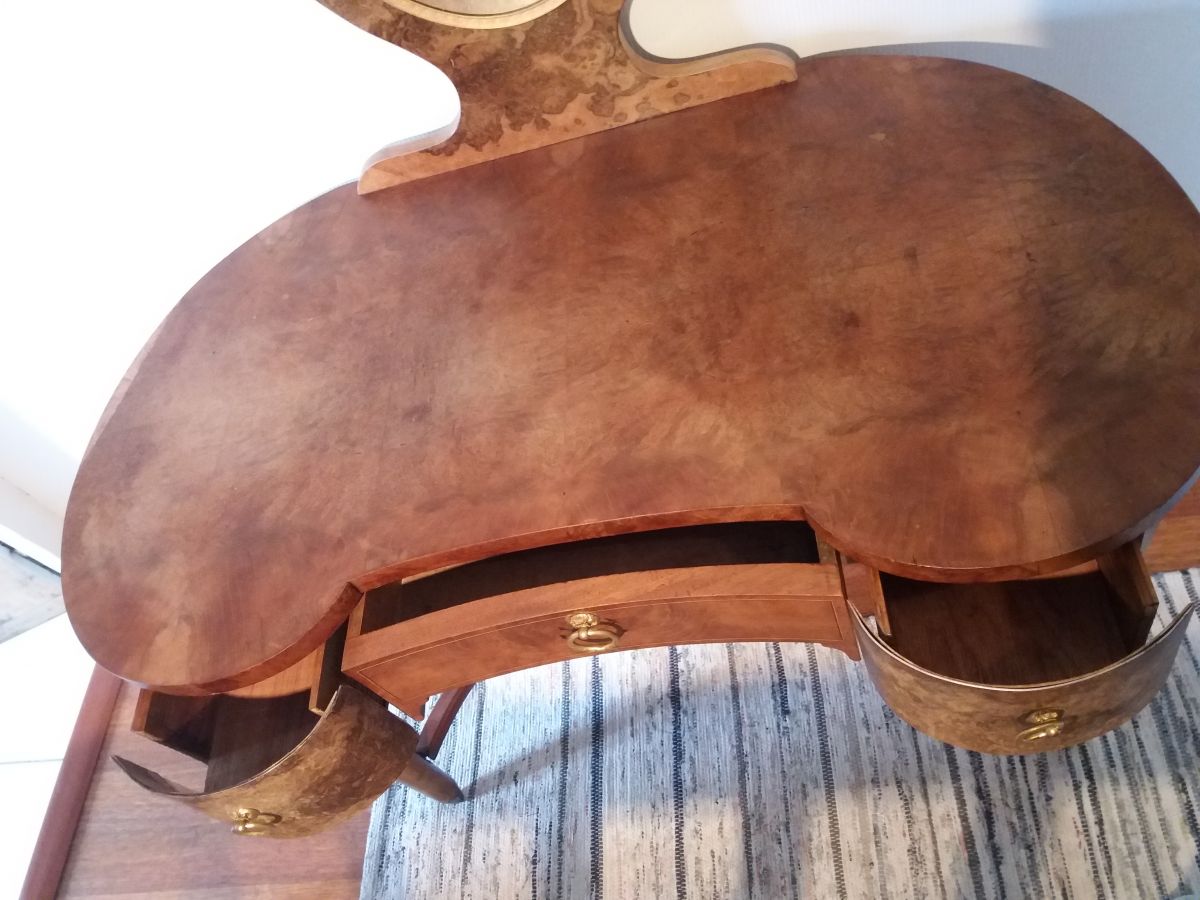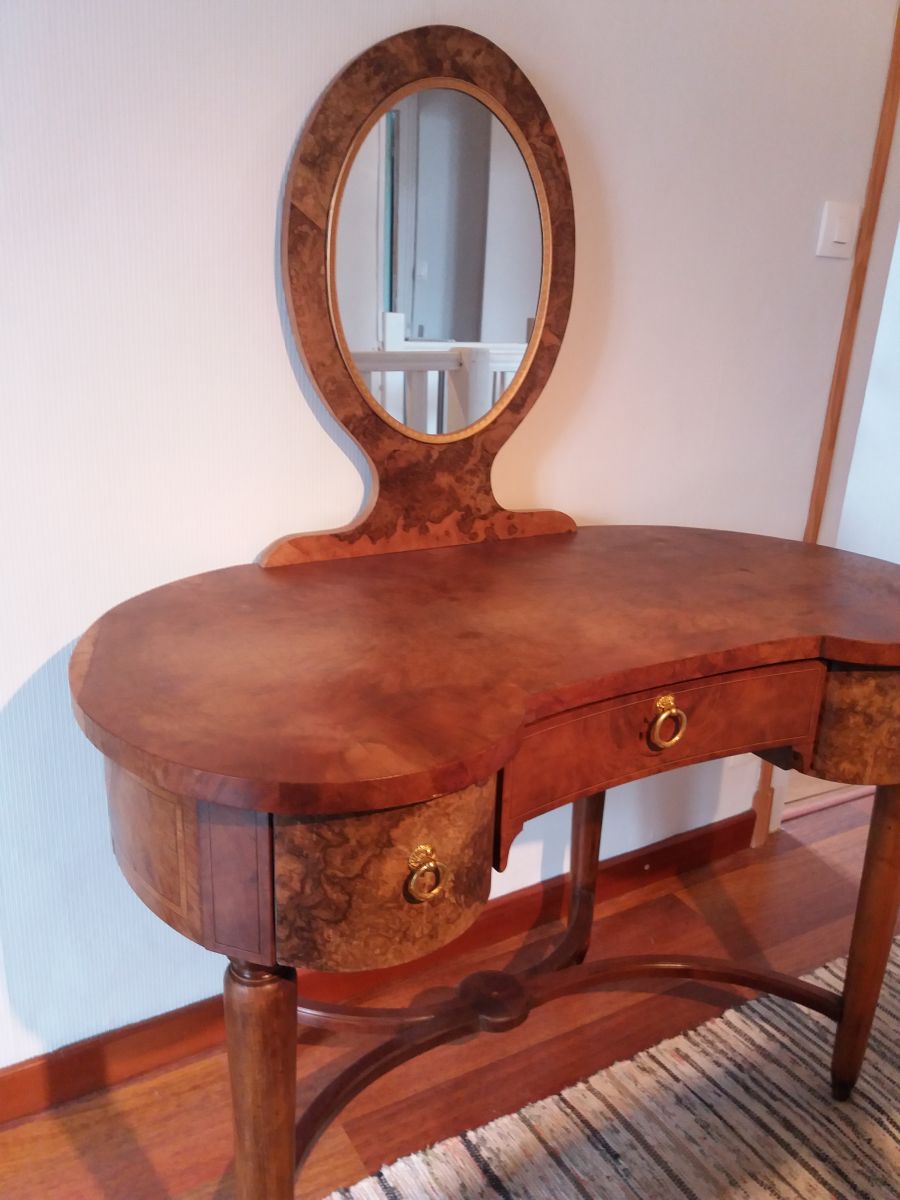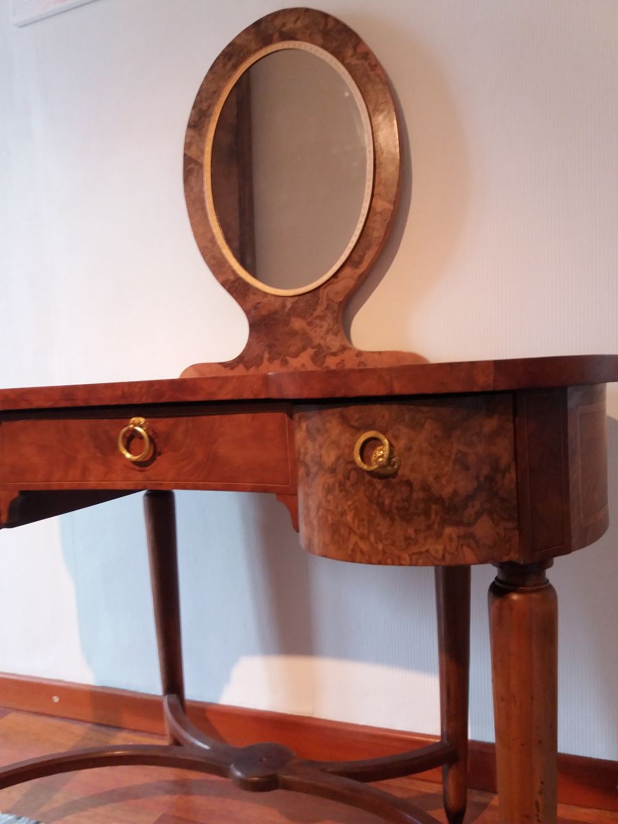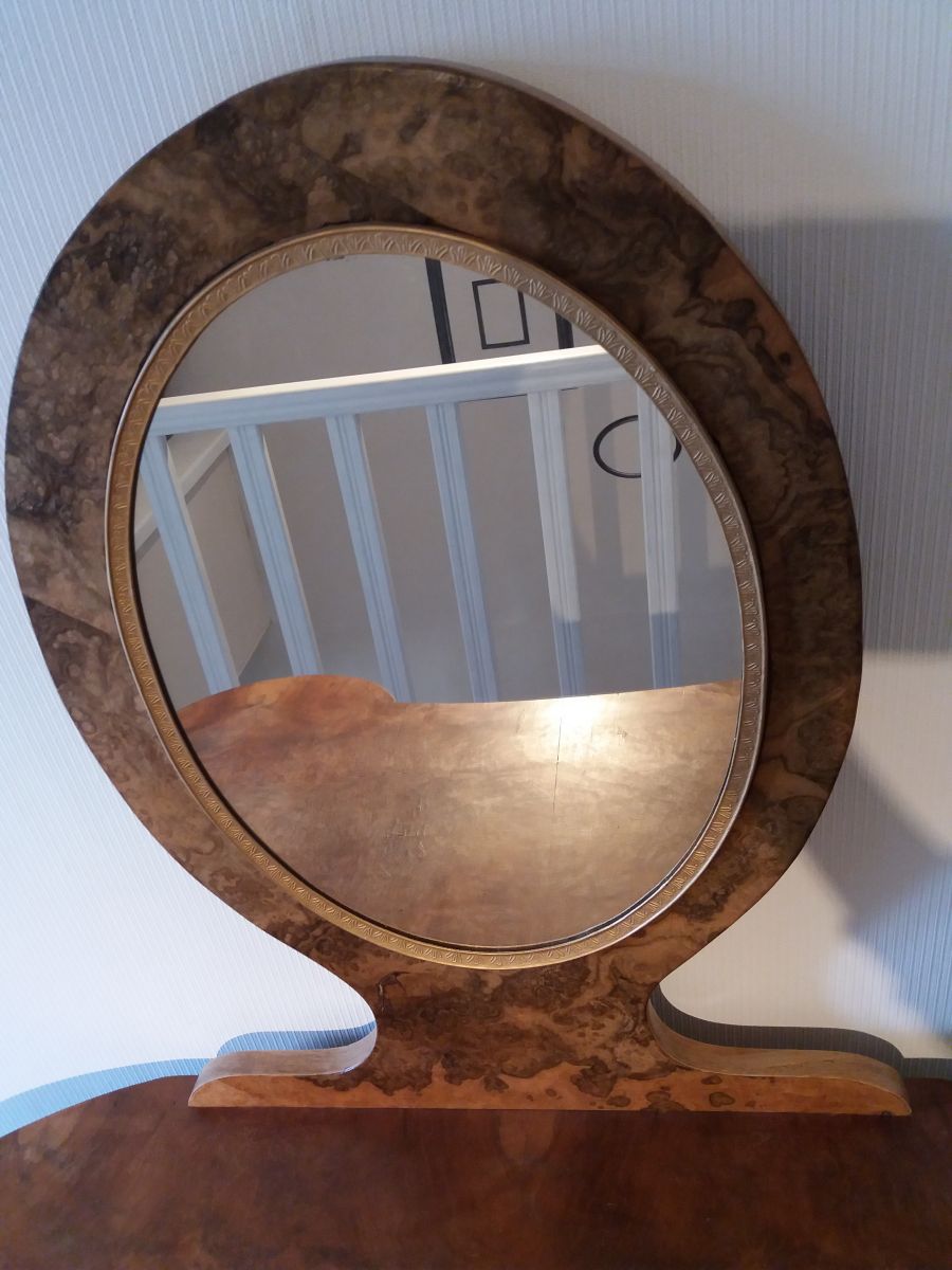 Ravissante coiffeuse de forme ROGNON en ronce de noyer – En très bon état. De style art-déco, elle repose sur 4 pieds cannelés - large tiroir sous la ceinture - 2 petits tiroirs de chaque côté. Le miroir de forme ovale entouré d’un métal doré, peut se retirer.