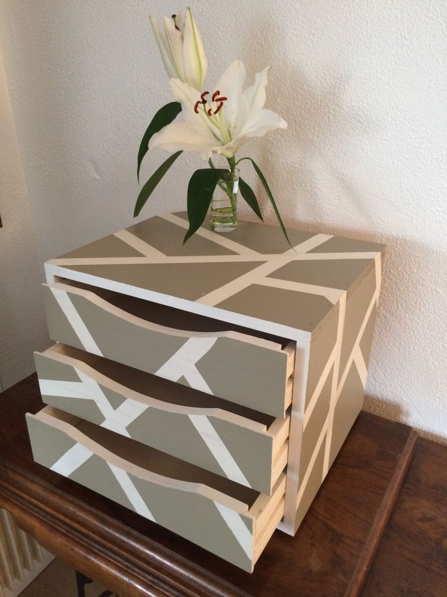 Petit meuble 3 tiroirs en pin, repeint en blanc et gris clair par mes soins, je l'ai recouvert de trois couches de vernis pour le rendre plus résistant et lessivable.