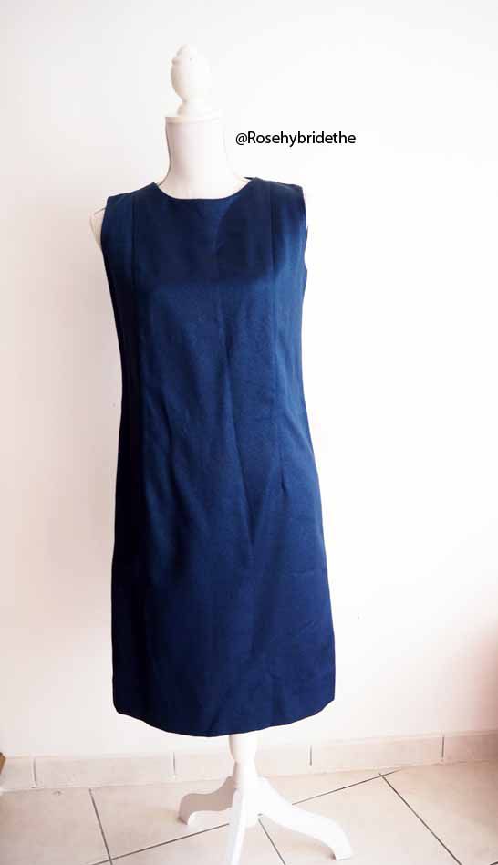 La robe a une coupe droite avec un col rond ras du cou et des pinces sur la poitrine.