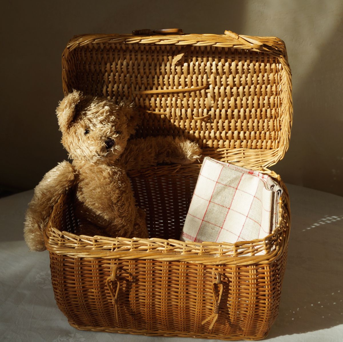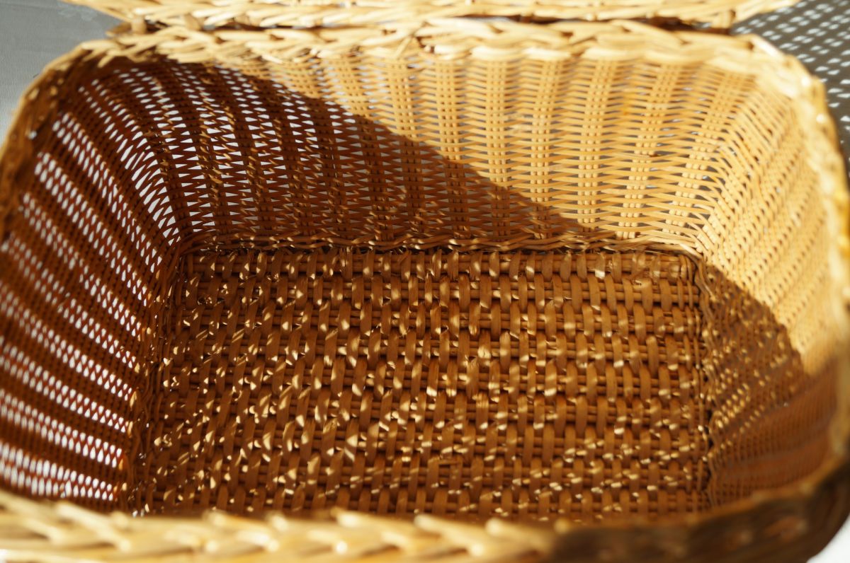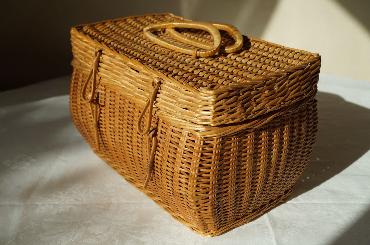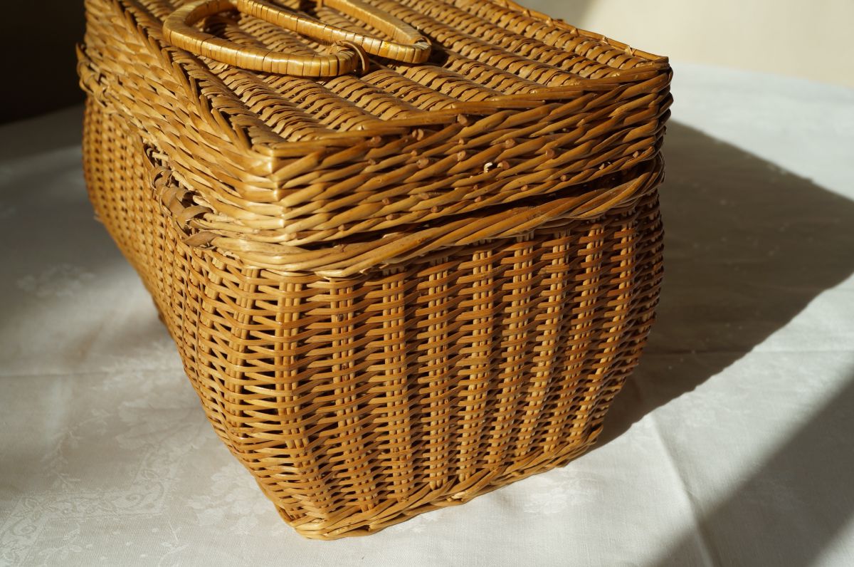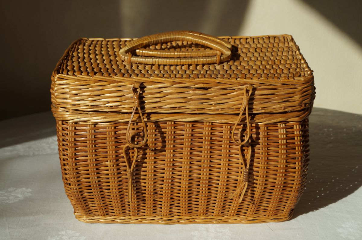 Valisette ancienne en osier, dont la fabrication présente plusieurs sortes de tissages.