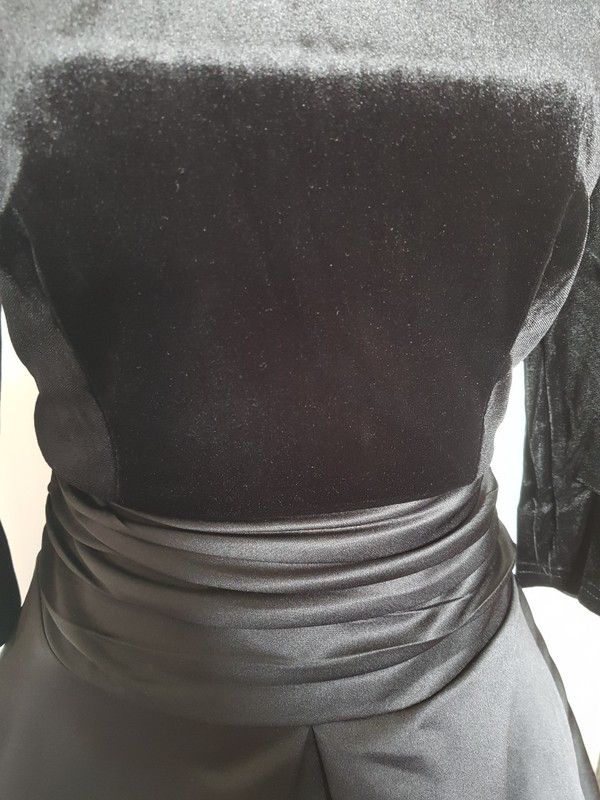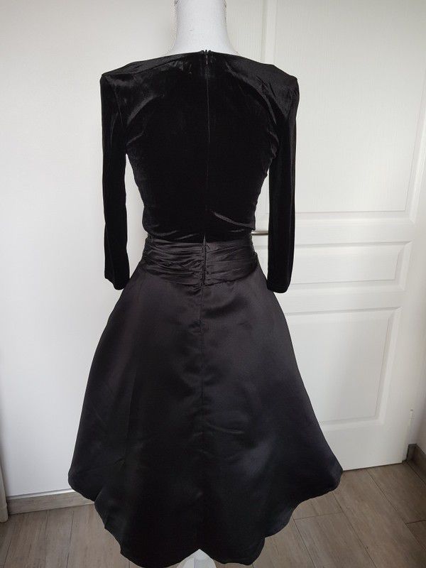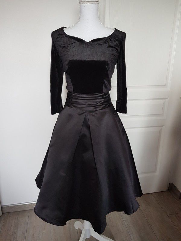 Robe pin-up style vintage de couleur noire. Le haut est en velours et le bas en tissu satiné. Présentée avec un jupon sous la jupe mais vendue sans.