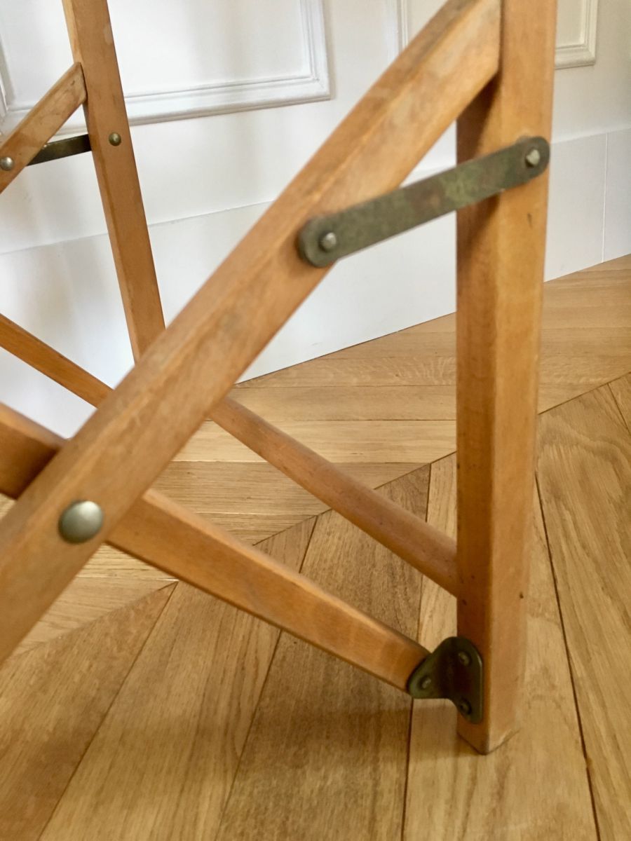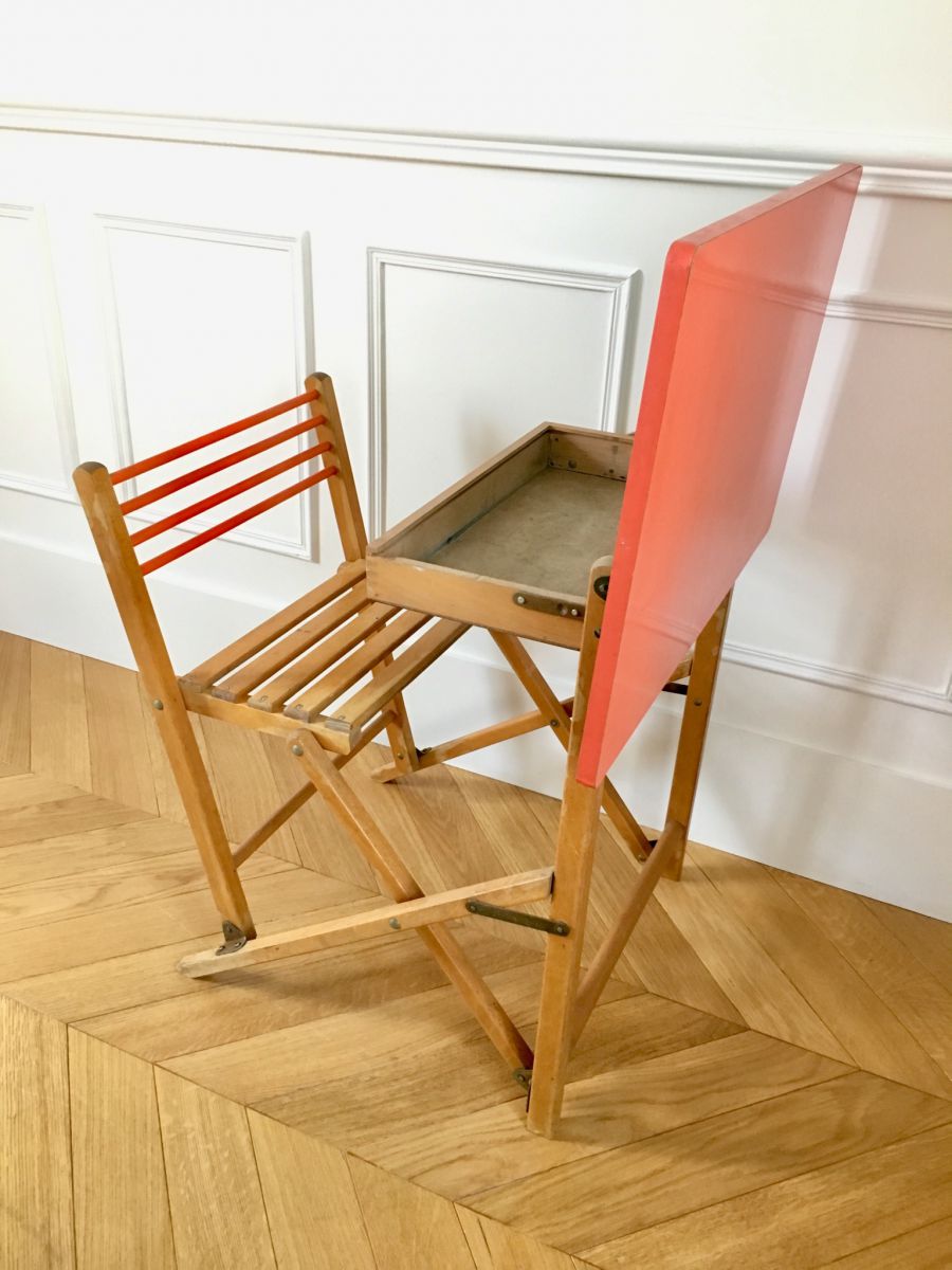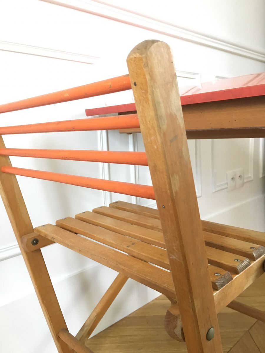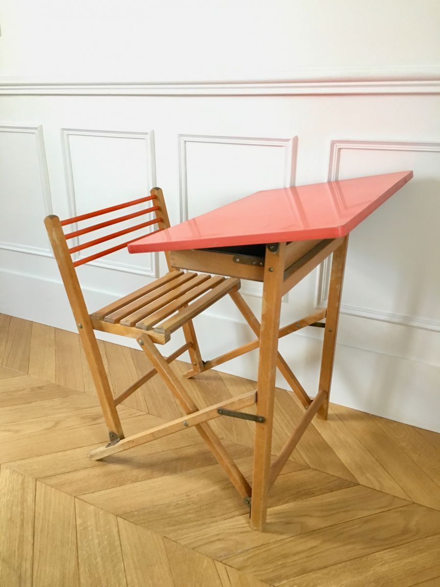 Adorable bureau pliant des années 50-60′ à une place avec son plateau en Formica orange et sa structure en hêtre clair. Le dessous de son plateau se transforme en tableau noir pour craies et peut s’ utiliser soit en position inclinée soit en position droite selon le confort cherché.
