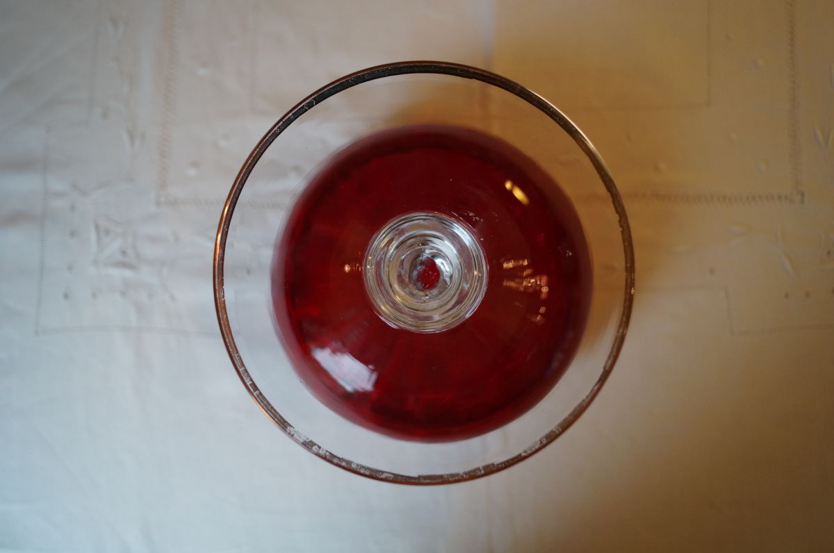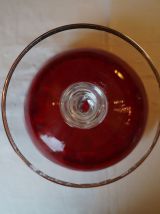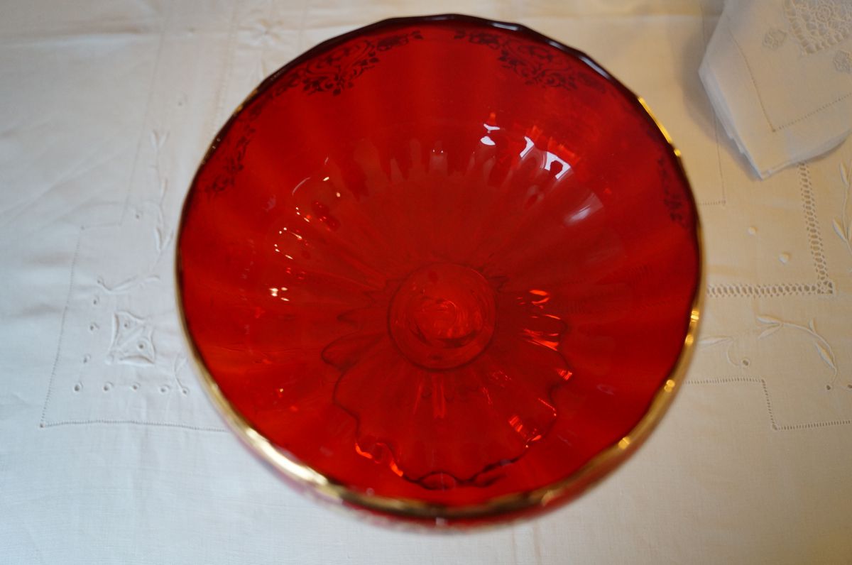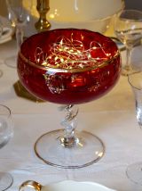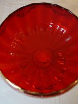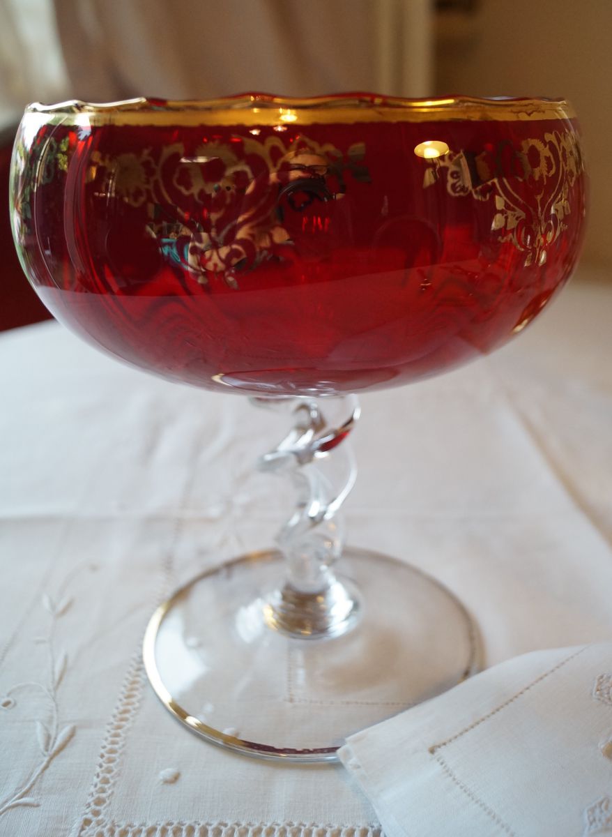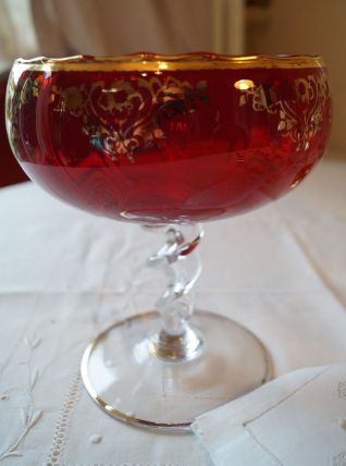 Très belle coupe en verre rouge et or, idéale comme centre de table de style baroque pour les fêtes. Son pied torsadé lui ajoute raffinement et originalité.