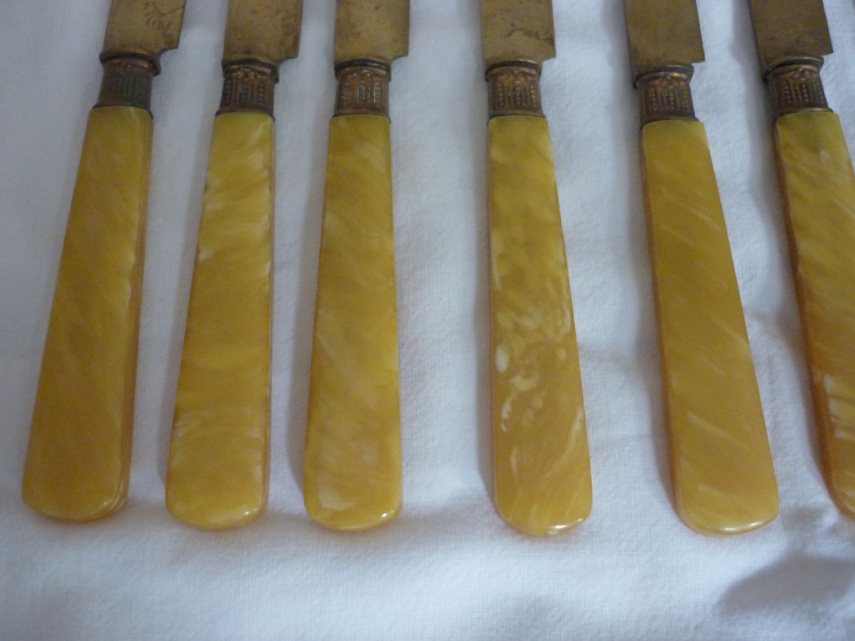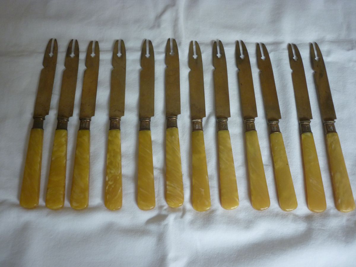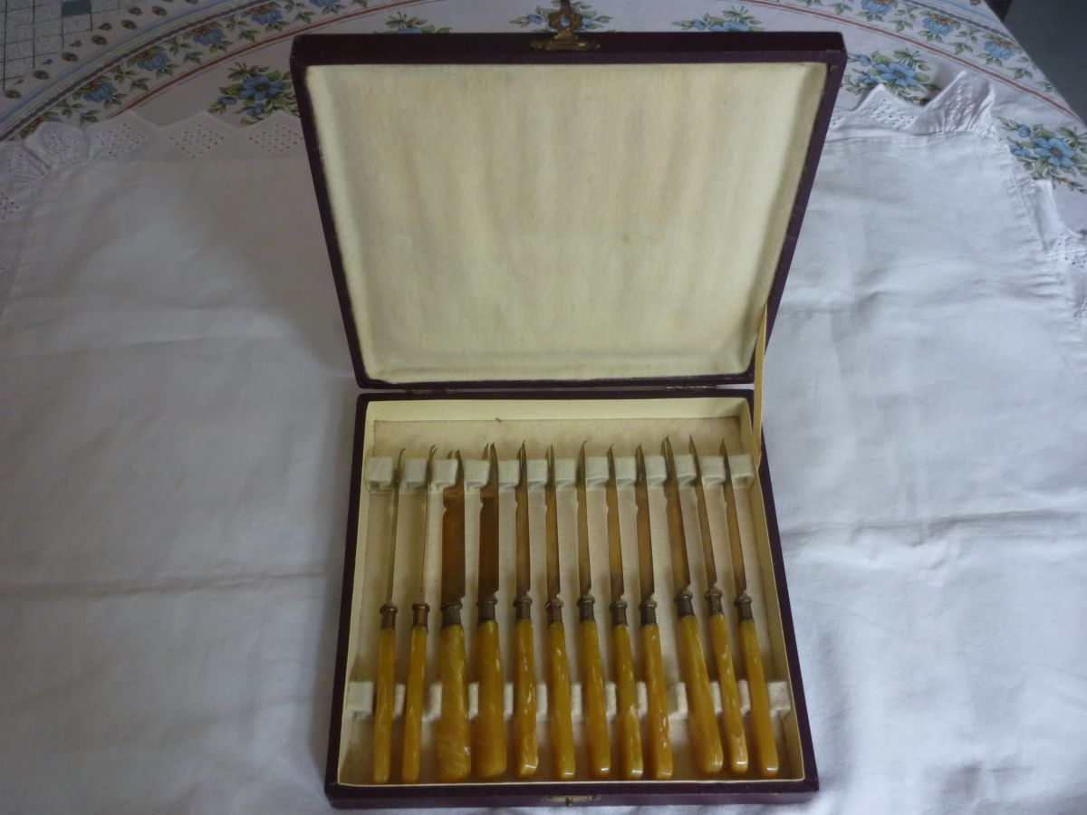 Coffret de 12 fourchettes et 12 couteaux a fruits et 12 pics escargots crustaces bakelite et metal doré