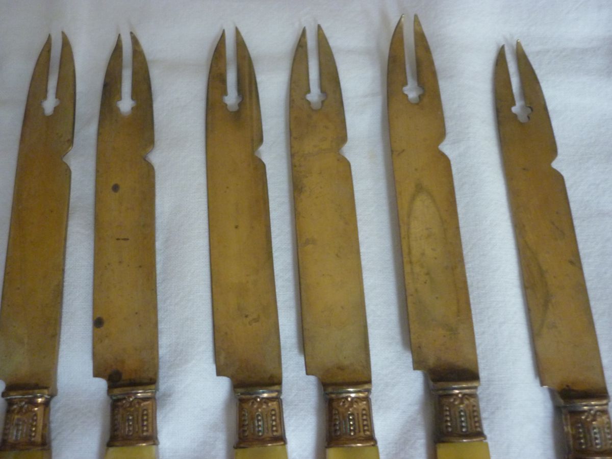 Coffret de 12 pics ou couteaux a 2 dents recourbees au bout pour escargots ou crustaces:manches en sorte de bakelite,viroles et lames en metal doré(a nettoyer et faire briller-dans leur jus):longueur 16,cms,coffret etat d'usage