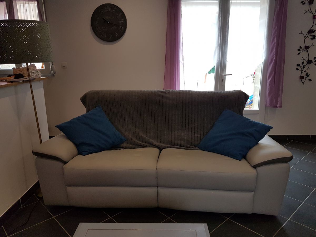 Canapé gris clair 2 places en simili cuir depliable en position relax.Possede juste un defaut d usure sur l appui tete gauche mais facilement cachable avec un plaid pour rendre plus décoratif.