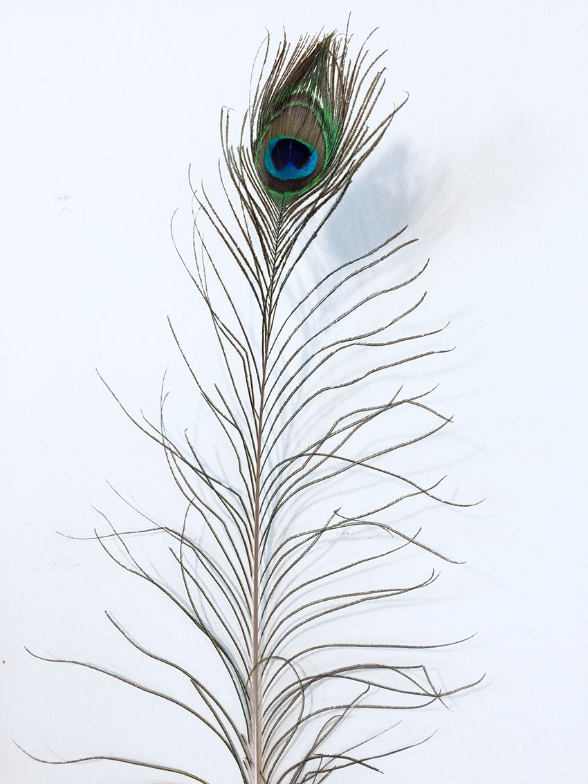 Plume de paon de grande taille, 130 cm. Au plus large environ 30 cm. Couleurs du vert presque fluo selon la lumière au bronze.