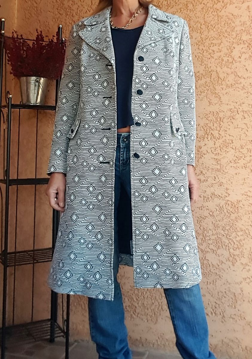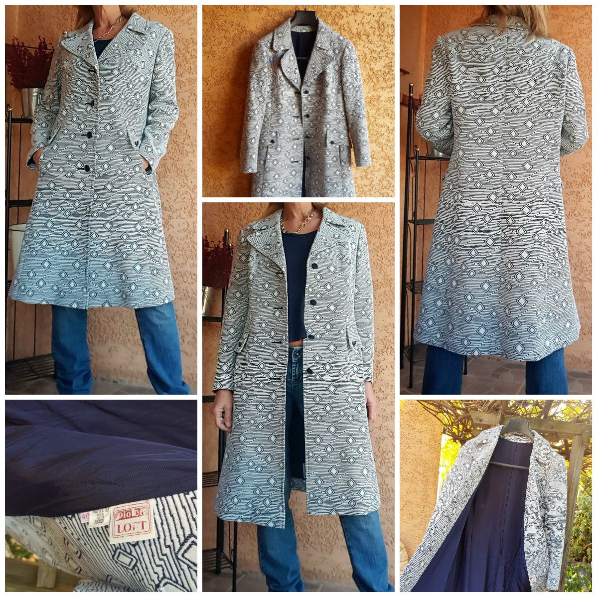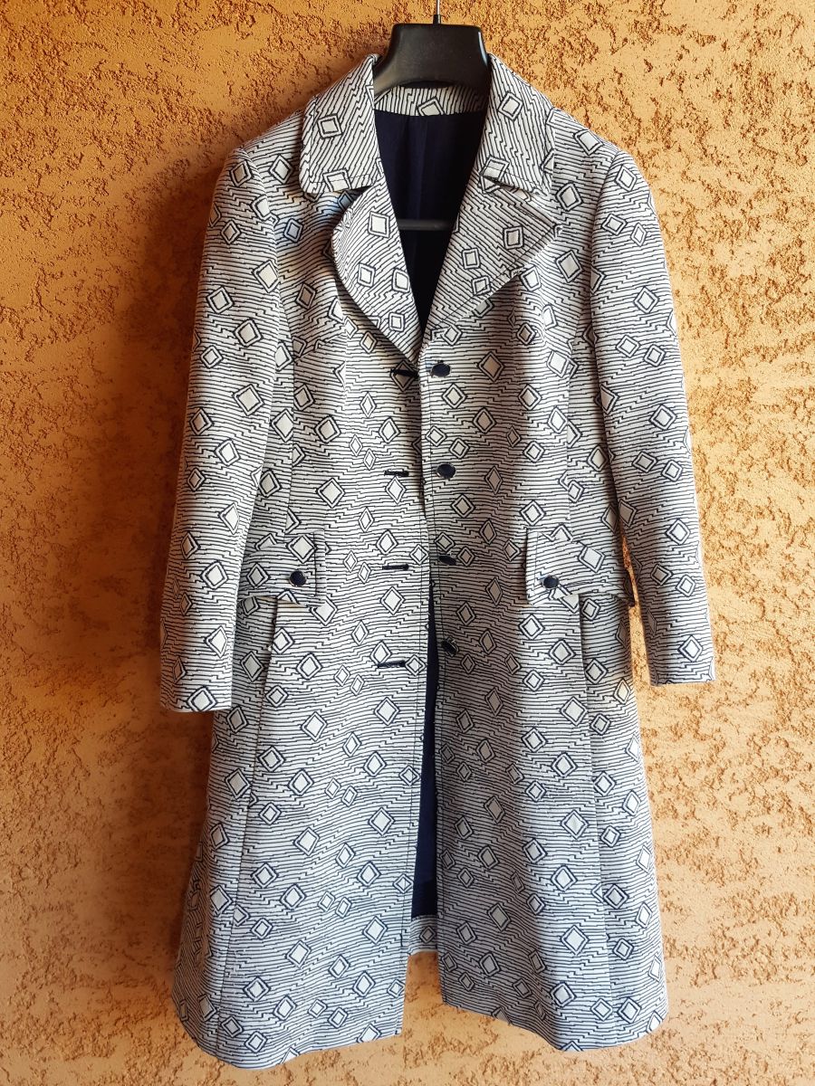 Manteau Diolen Vintage - TBE - taille 40 - à motif bleu - entièrement doublé - fermeture boutonnée - 2 poches côté + 2 rabats fausses poches - Polyester - Longueur 98 cm largeur épaule 42 cm - envoi rapide et soigné.