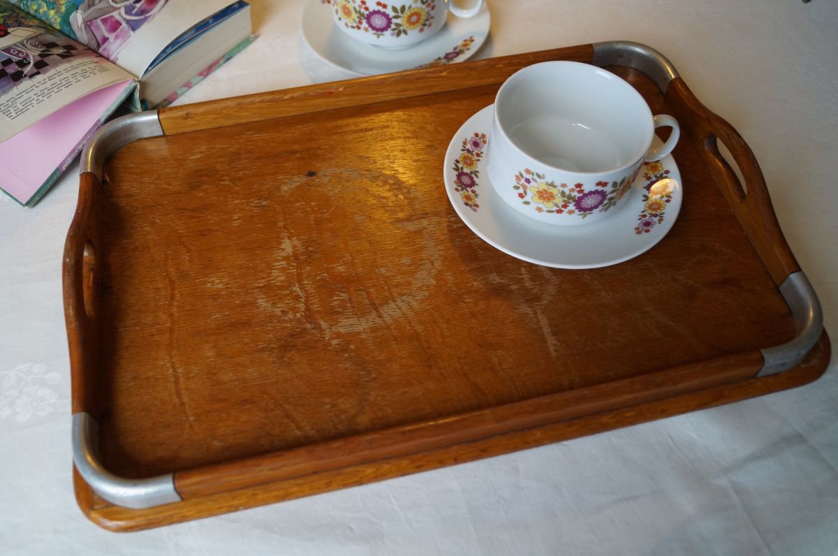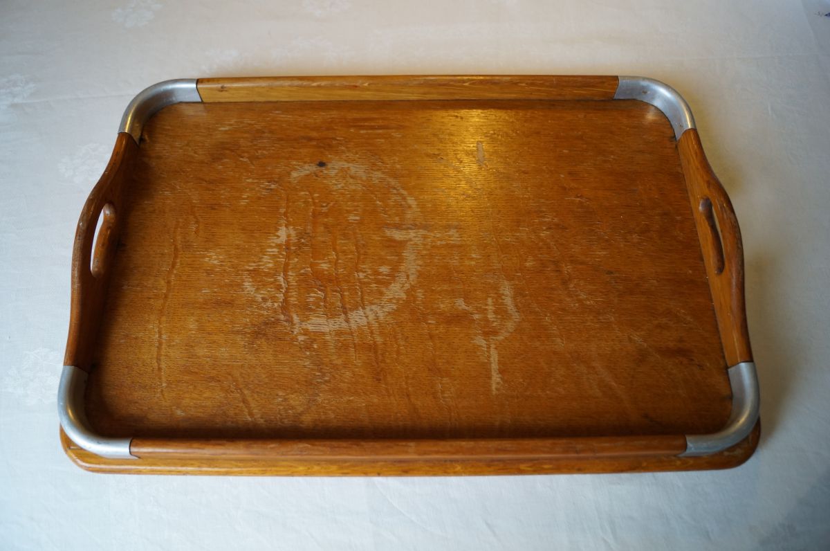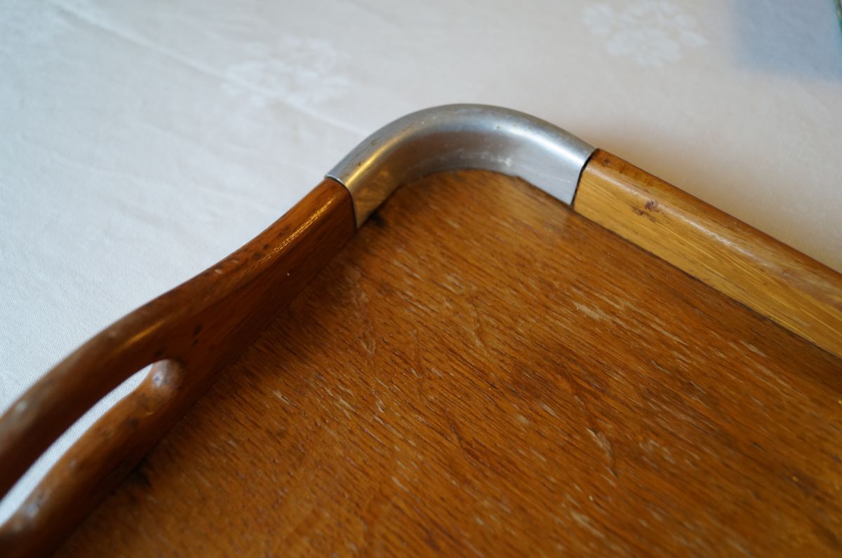 Ancien plateau en bois et métal, années 30-40, poignées sculptées dans le bois.