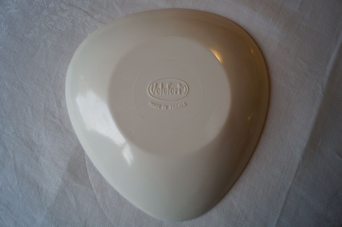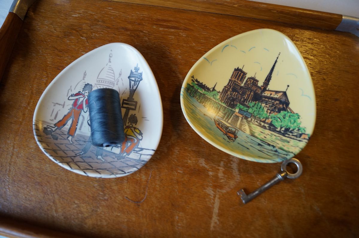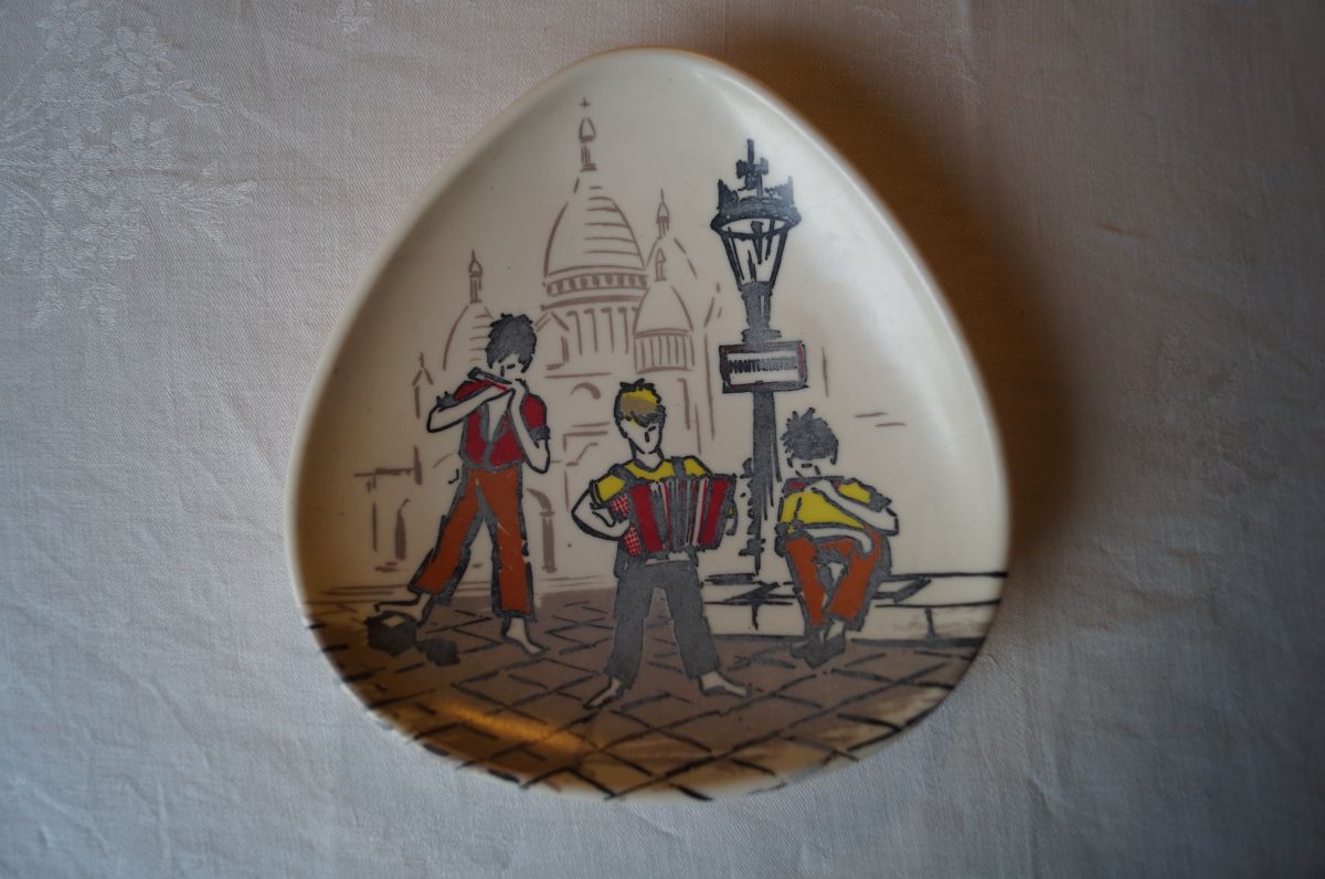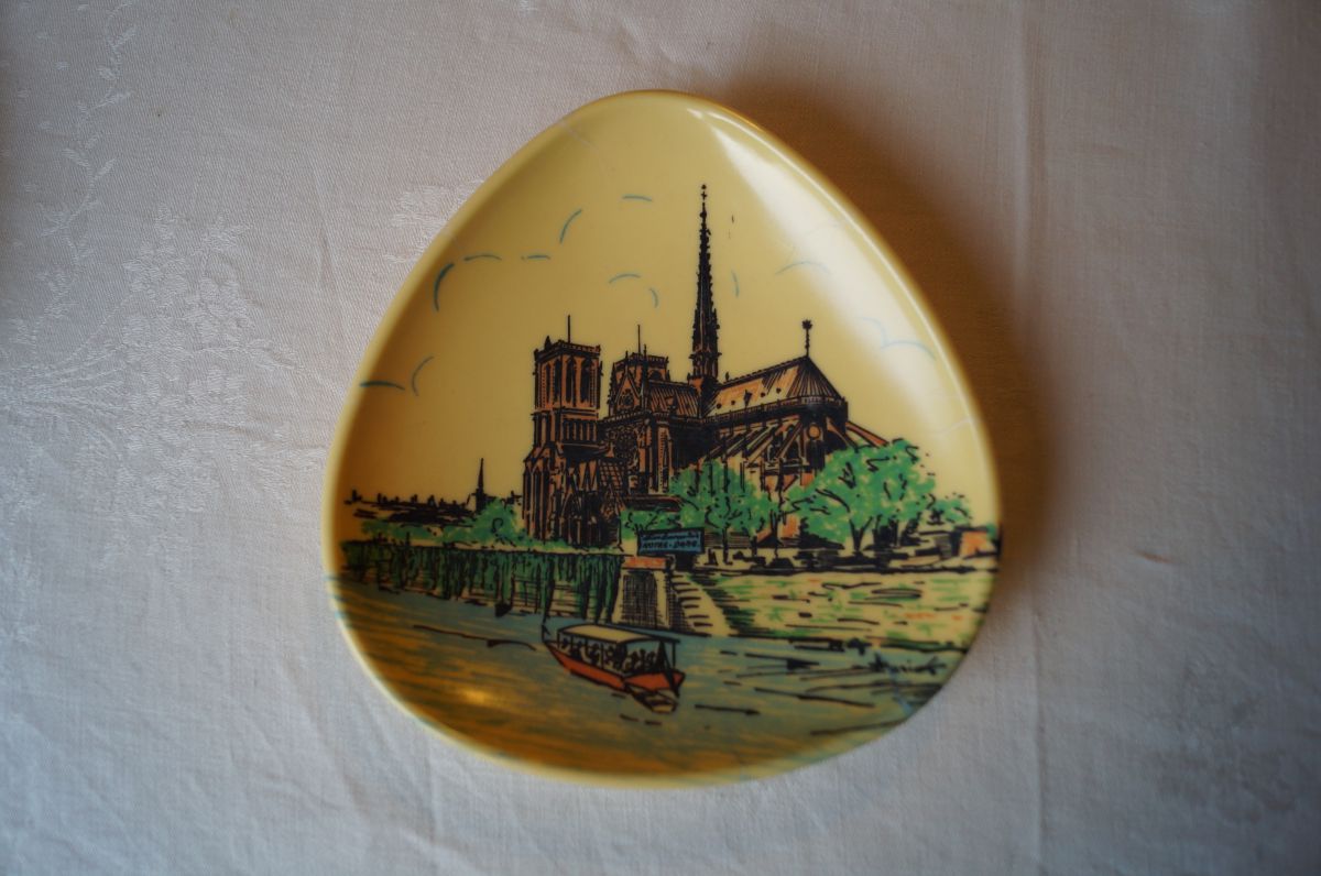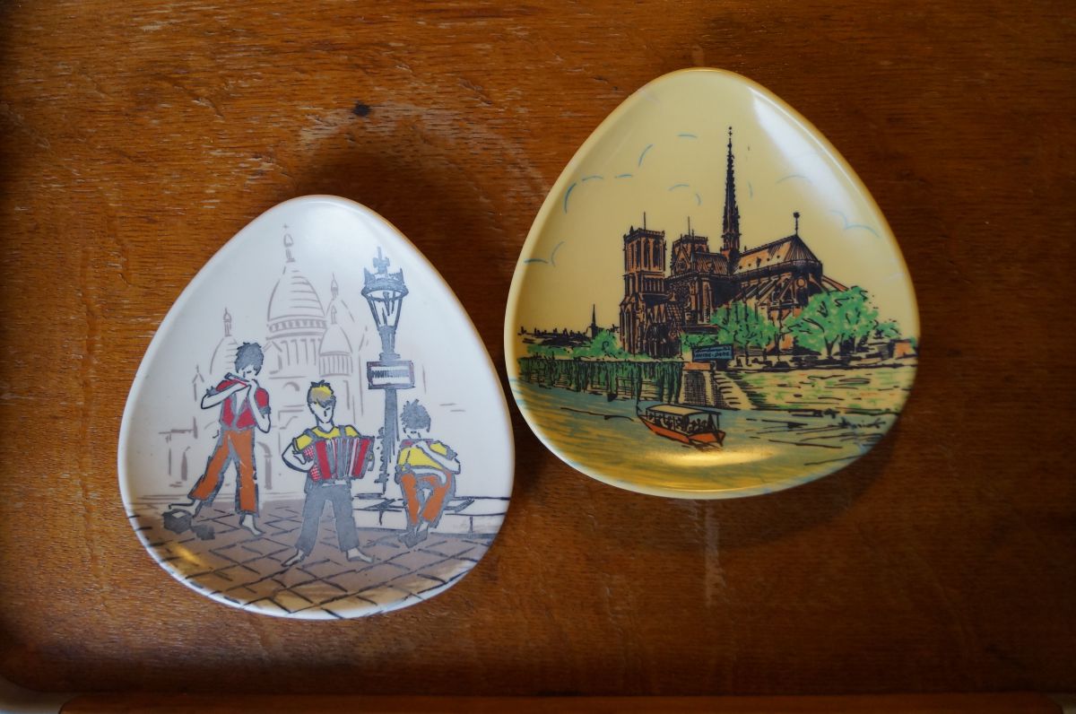 Deux vide-poches vintage en mélamine de la marque Voluform représentant pour l'un une vue de la Seine avec la Cathédrale Notre-Dame de Paris, pour l'autre un groupe de jeunes musiciens de rue dans le quartier de Montmartre.