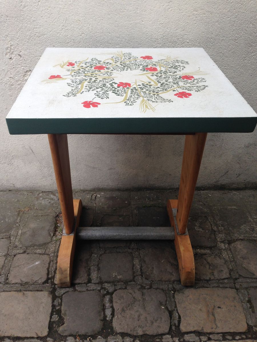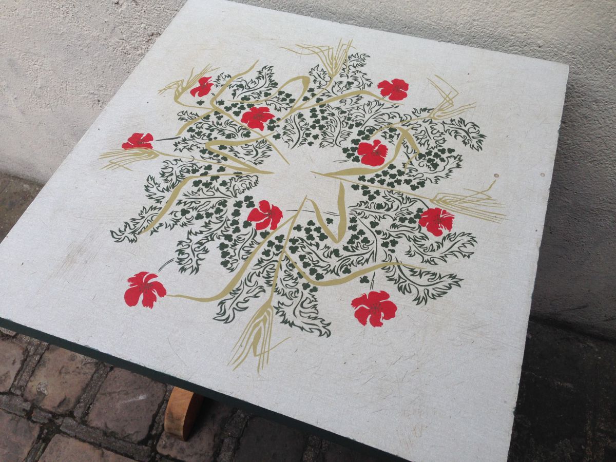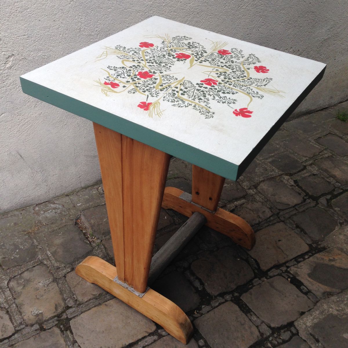 Plateau en formica chiné gris avec un très joli décor de blé et de coquelicots, quelques traces sur le plateau ( voir photos). La tranche du plateau a été peinte en vert eucalyptus.