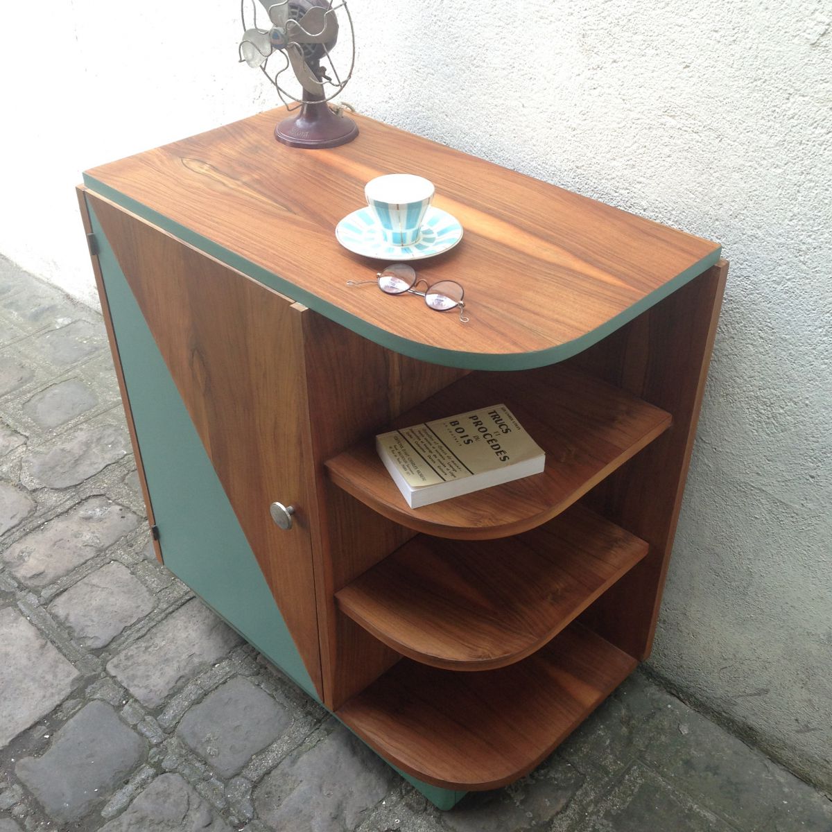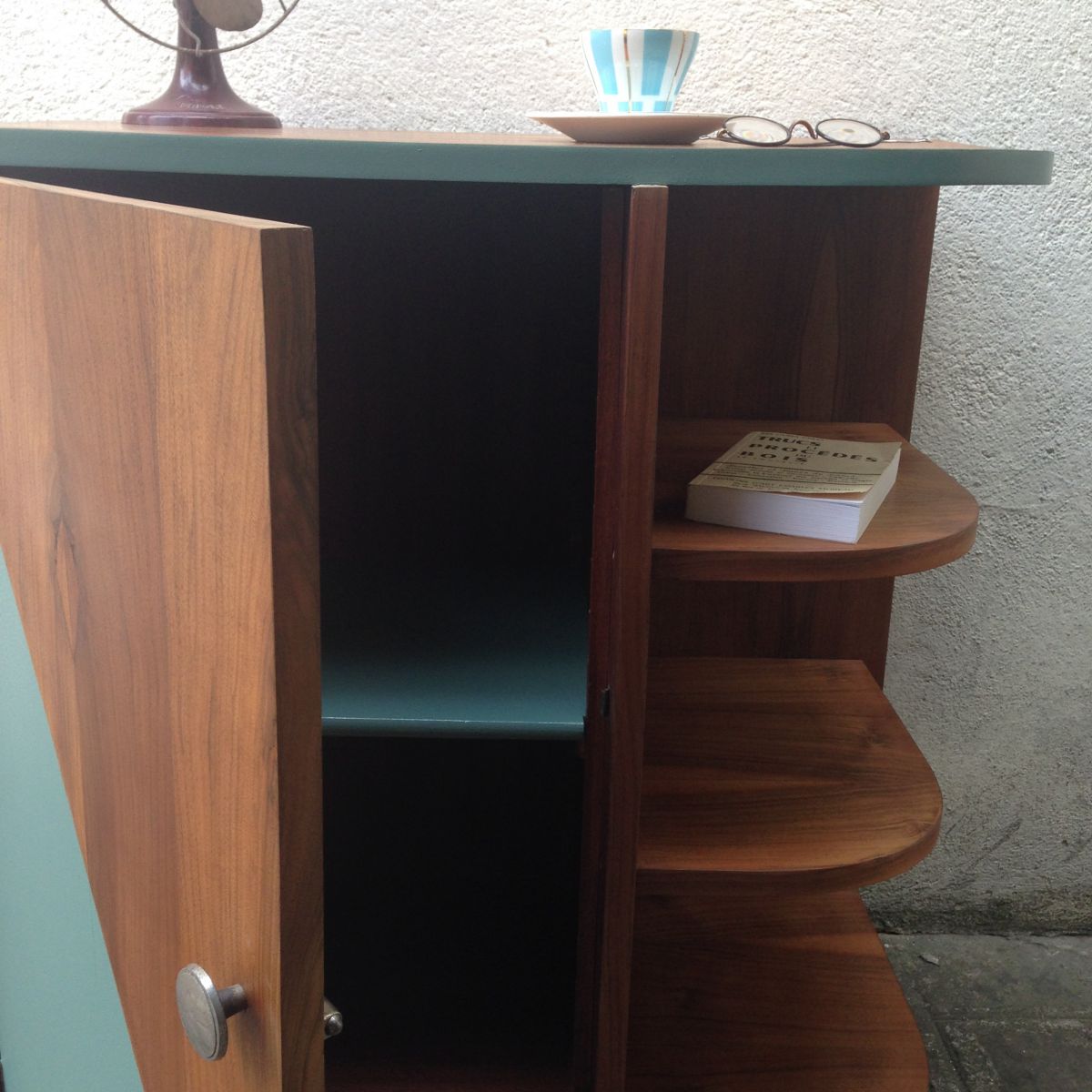Il dispose d'un espace fermé par une porte ouvrant sur une étagère ( peinte en vert eucalyptus) et d'un espace de 3 étagères aux rebords découpés en arrondis.