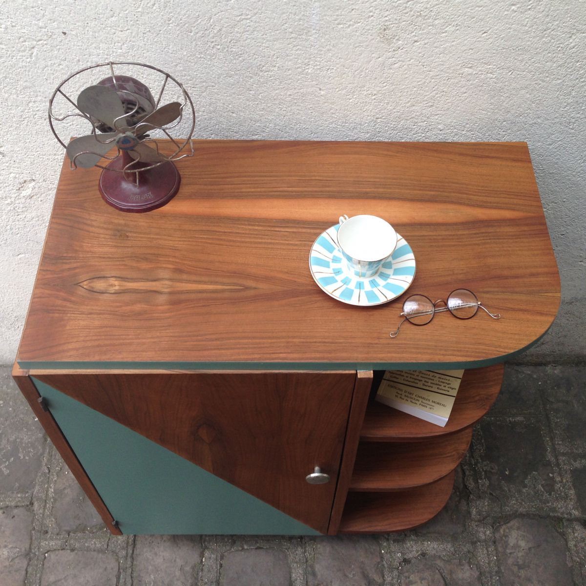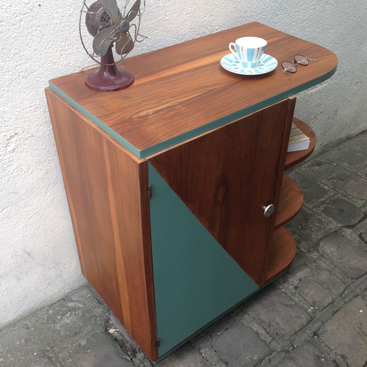 Le meuble est ciré en chêne moyen, verni ( vernis mat) sur le dessus pour résister aux taches, la porte est composée d'un motif de gros triangle en vert eucalyptus.