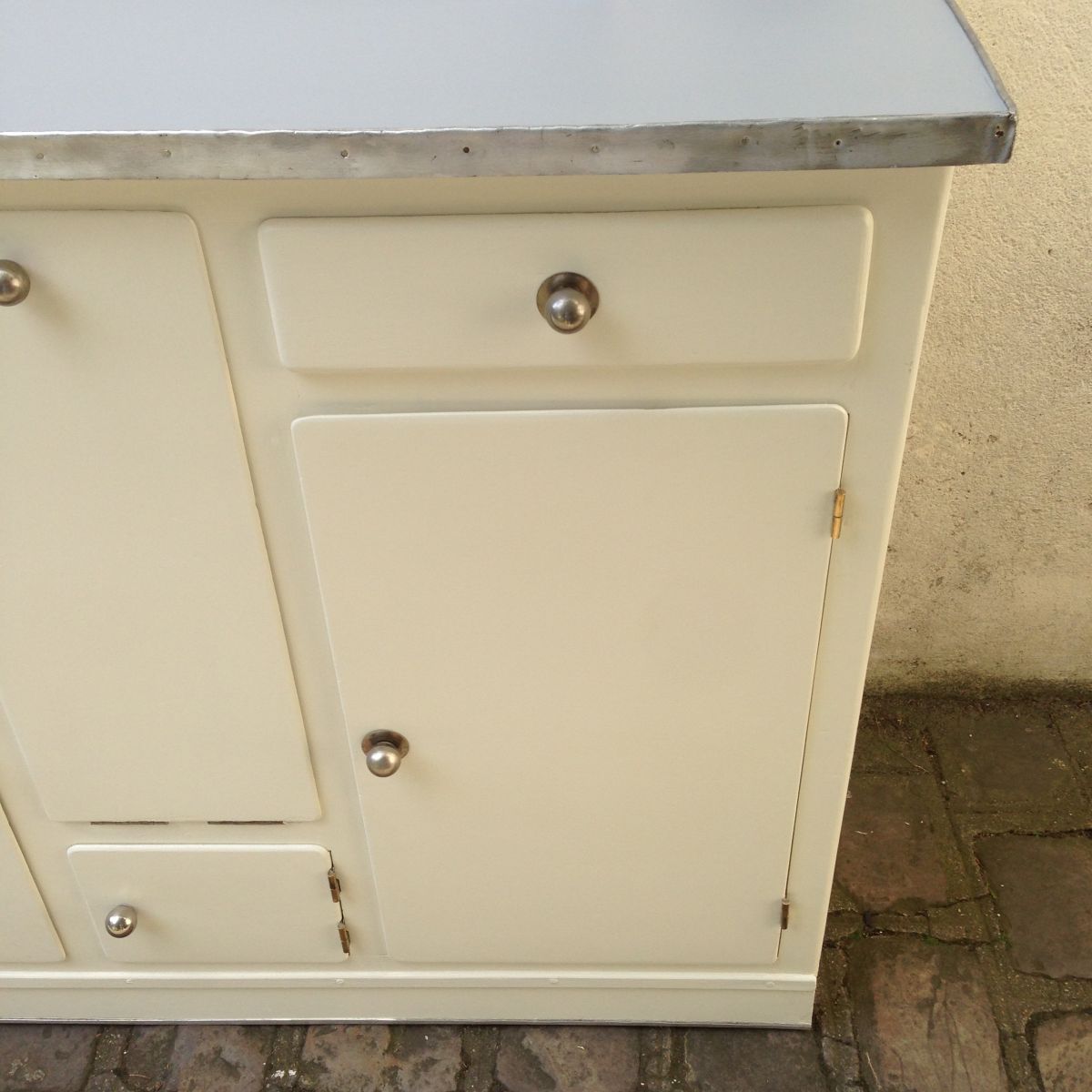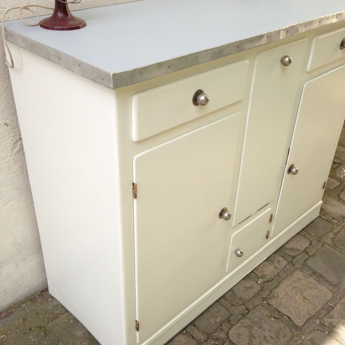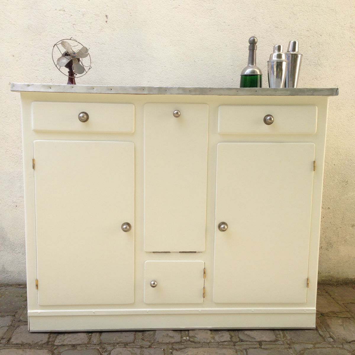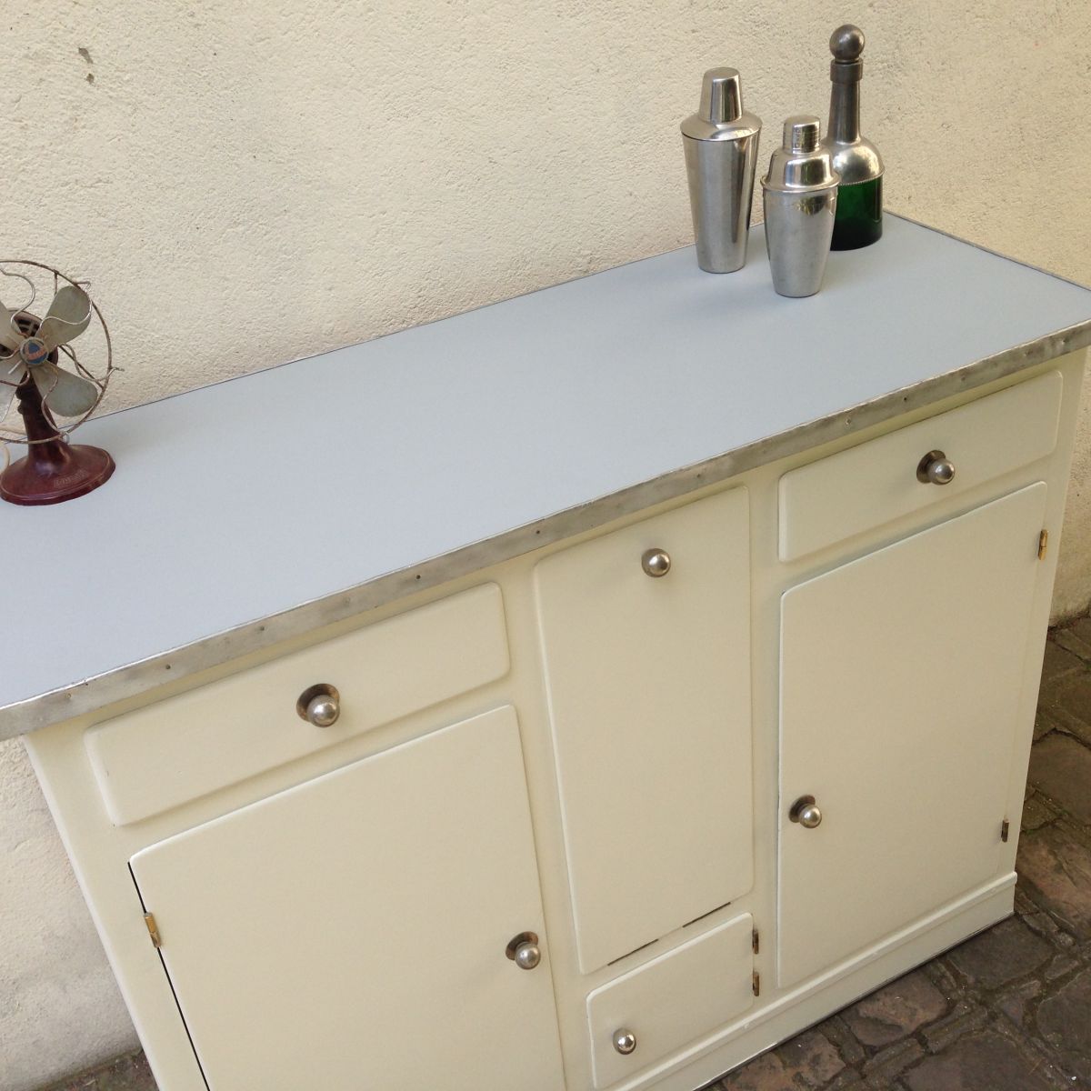 Les poignées boule typiques,le contour du plateau du dessus en aluminium et le compartiment huche à pain donne à ce buffet une très belle allure.