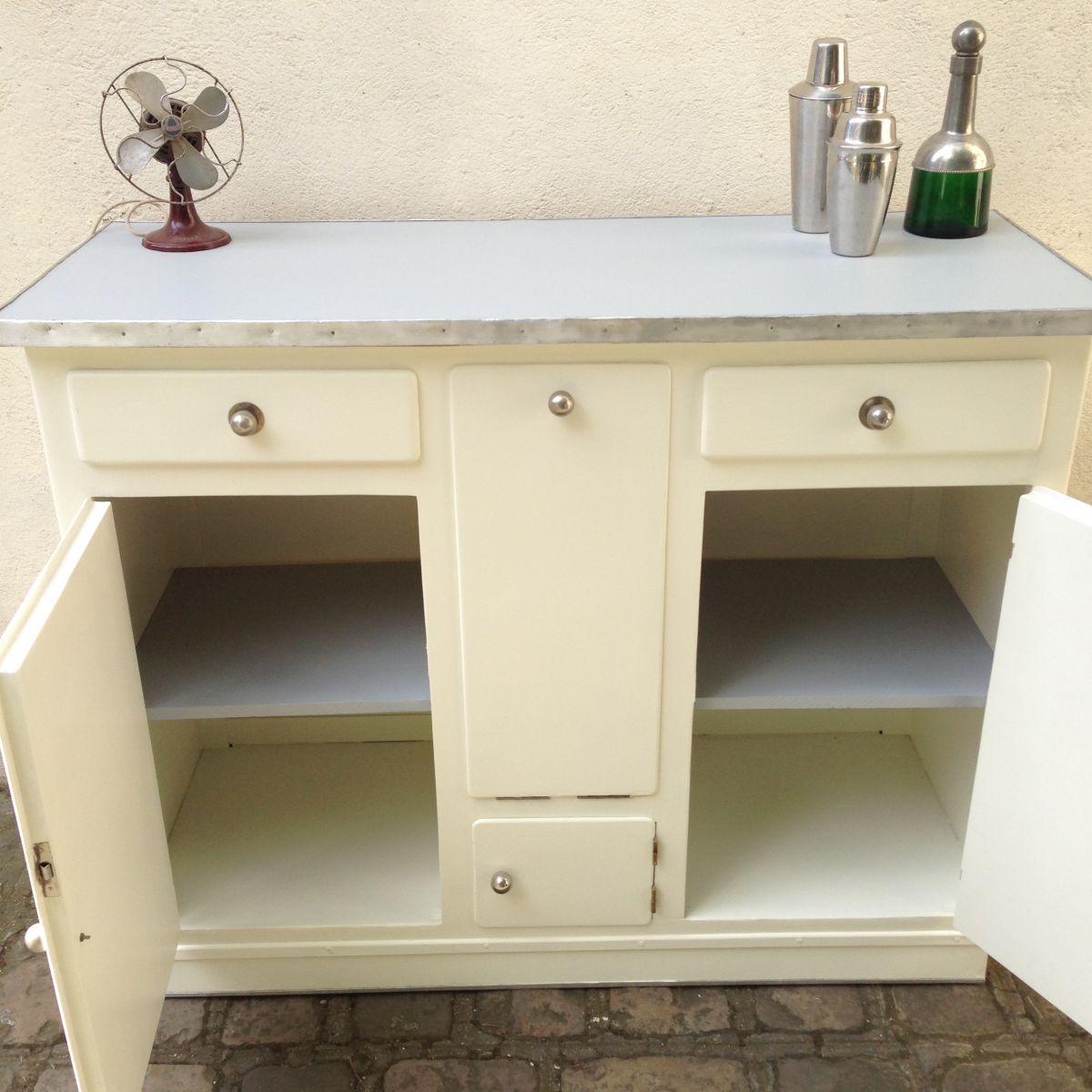 Très beau buffet entièrement poncé et repeint en crème. Le dessus et les étagères sont en gris perle.Le dessus et vernis pour plus de résistance.