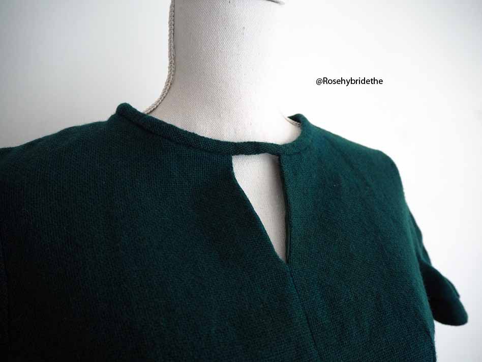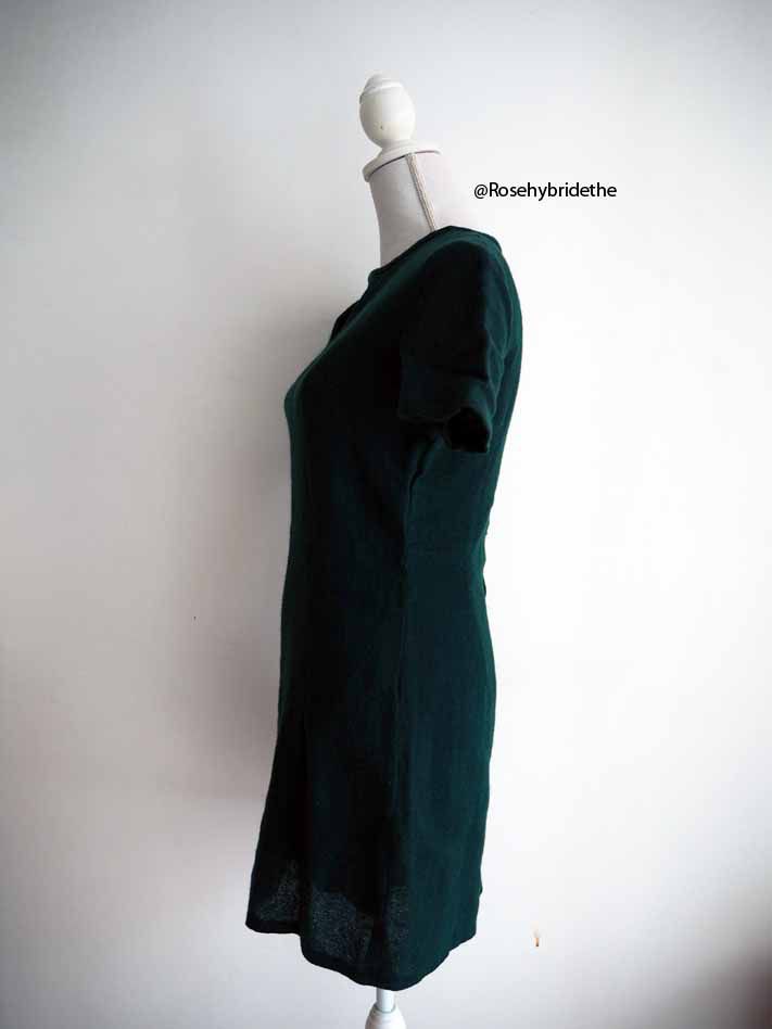 La robe est composée de laine mélangée (certainement à du synthétique). L'aspect du tissu me fait un peu penser à une toile de jute car les mailles sont assez grossières et un peu rêches. Il y a une doublure intérieure.