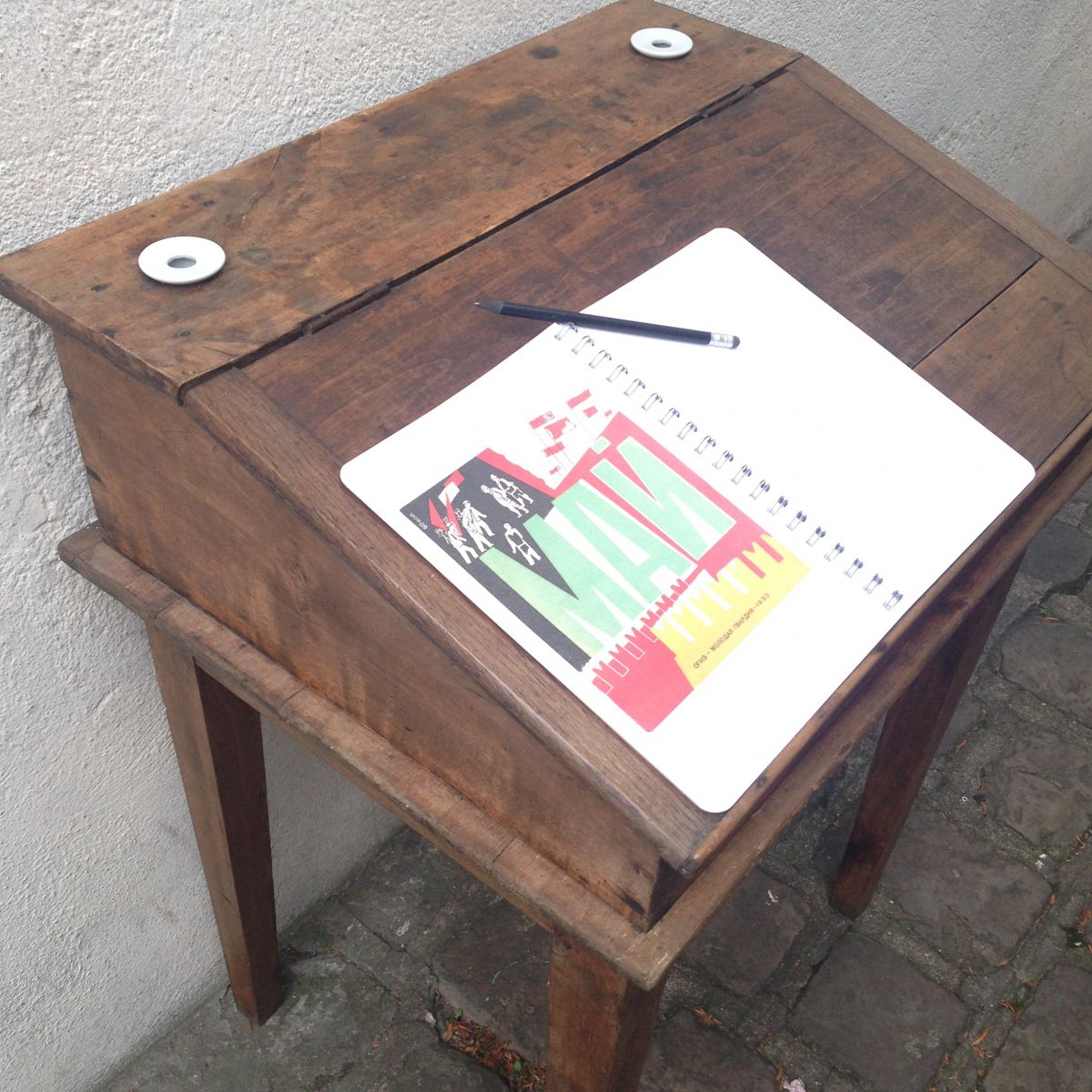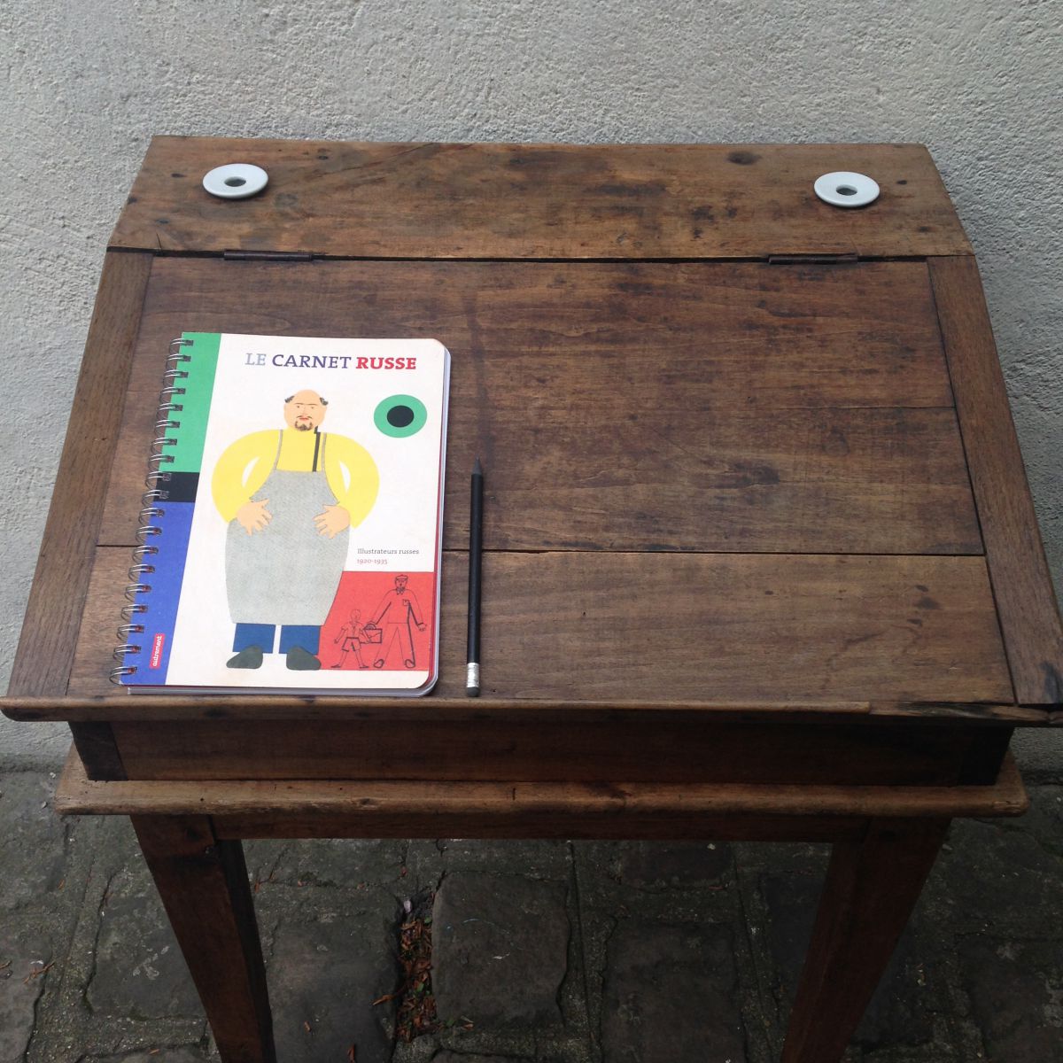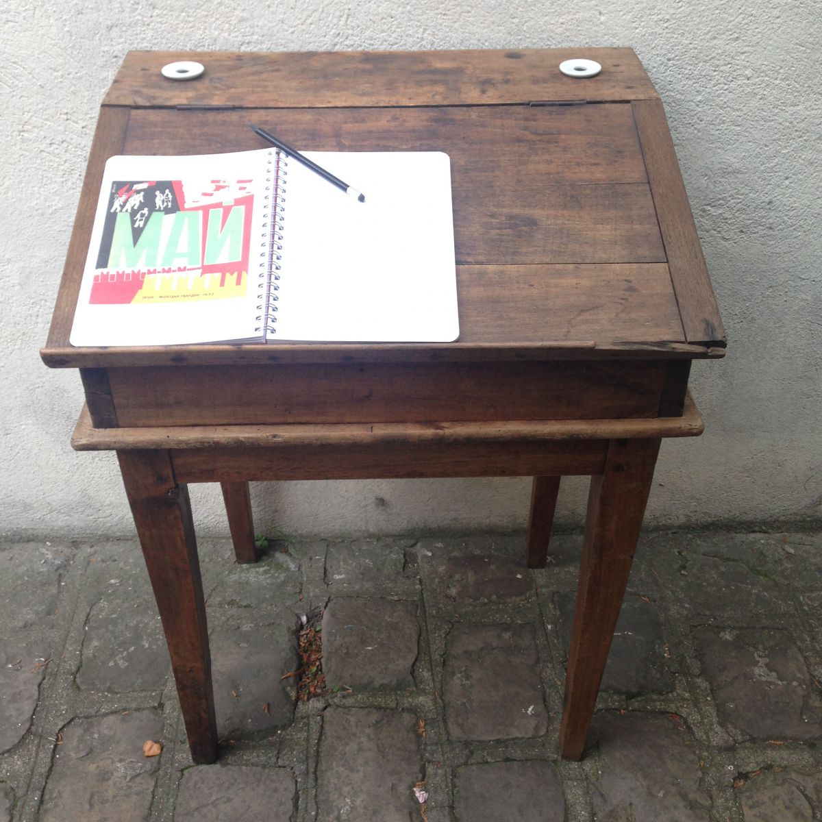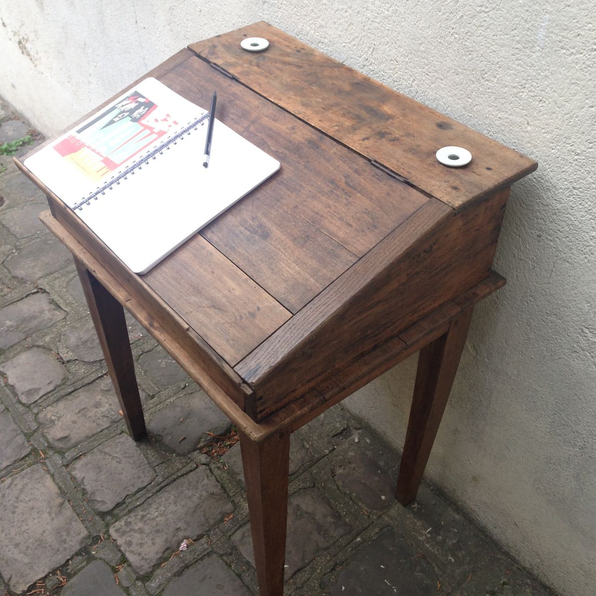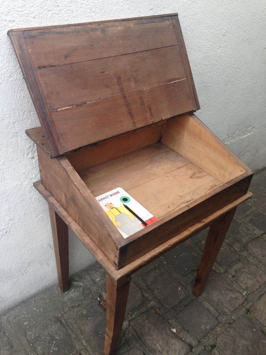 Pupitre d'écolier avec jolie patine.Deux encriers en porcelaine de chaque cotés.