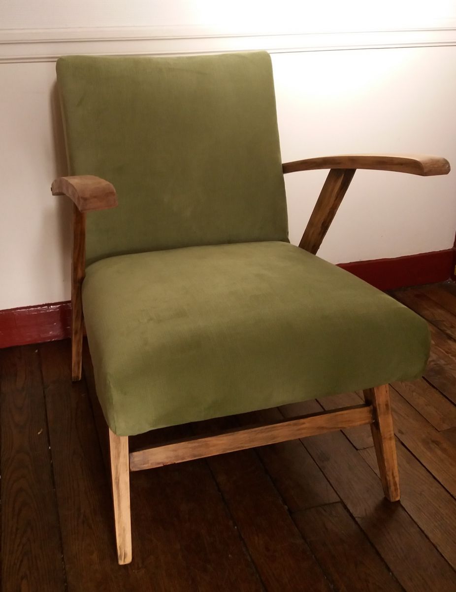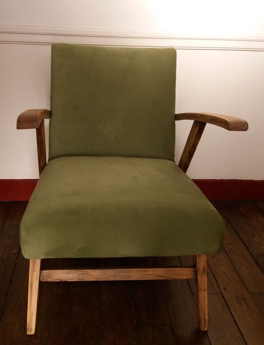 Magnifique fauteuil scandinave vintage année 60, entièrement restauré avec une structure élégante en hêtre.