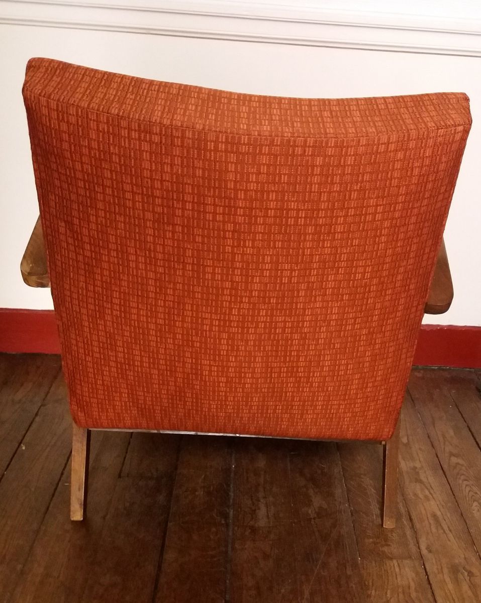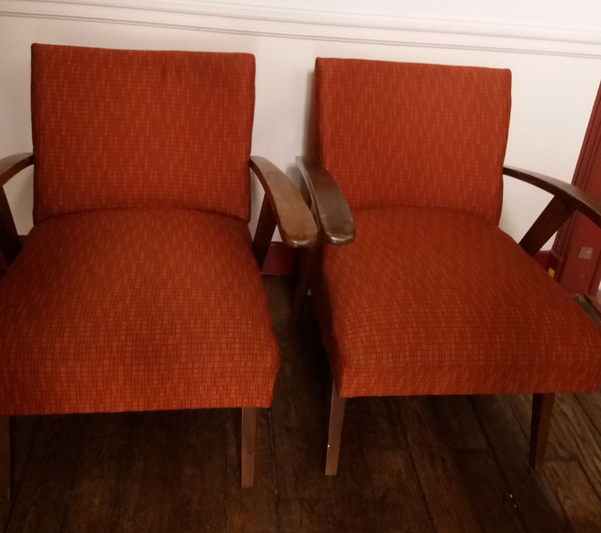 Très belle paire de fauteuils vintage scandinave des années 60, structure en bois massif, tissue d'origine. Accoudoirs courbe. Bon état général. Très confortables, leurs dimensions permettent de les intégrer facilement dans une petite surface.