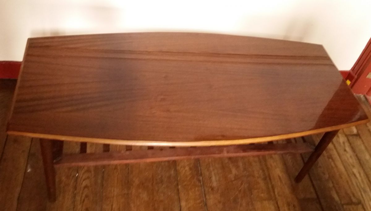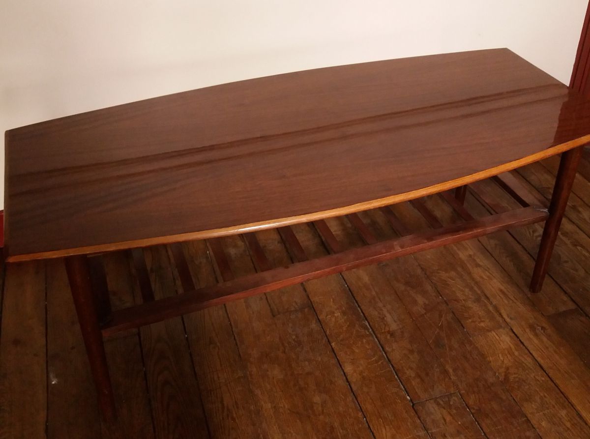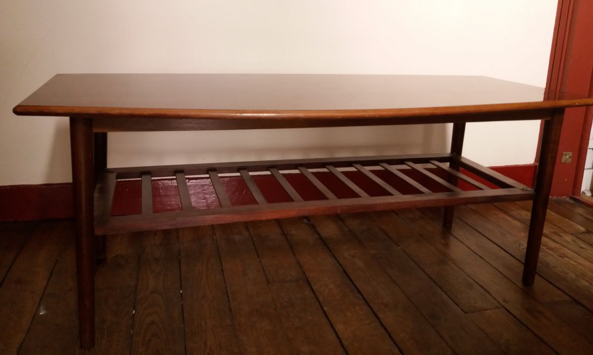 Très belle table basse scandinave des années 60, en noyer avec deux plateaux. Très bon état général.
