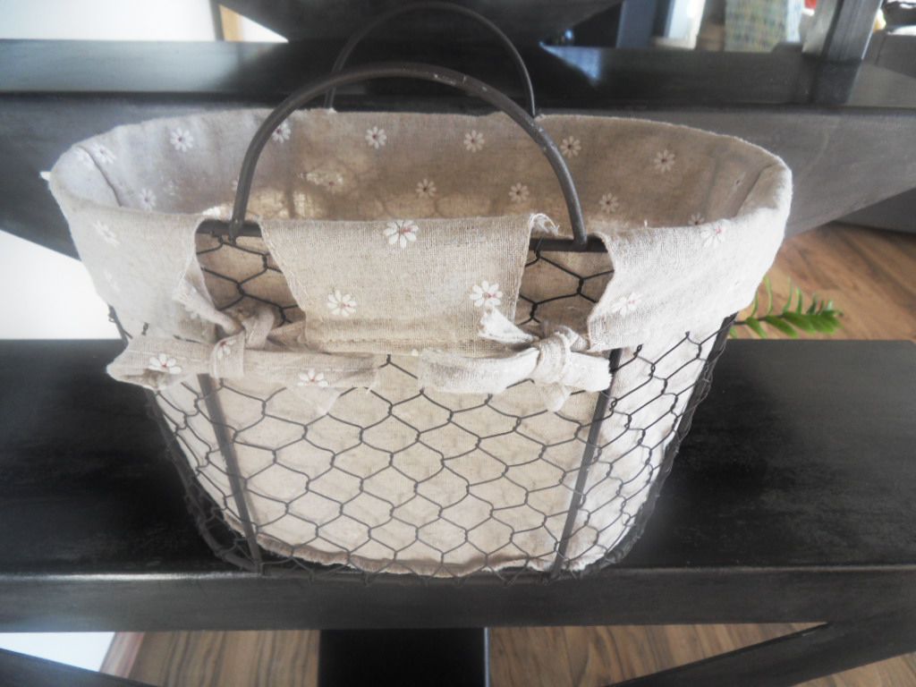 Joli panier en métal grillagé avec tissus imprimé de petites marguerites.