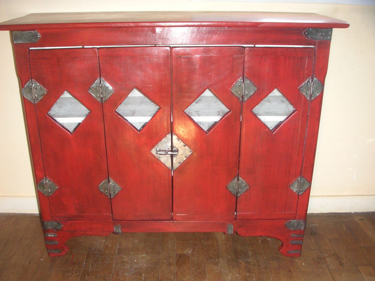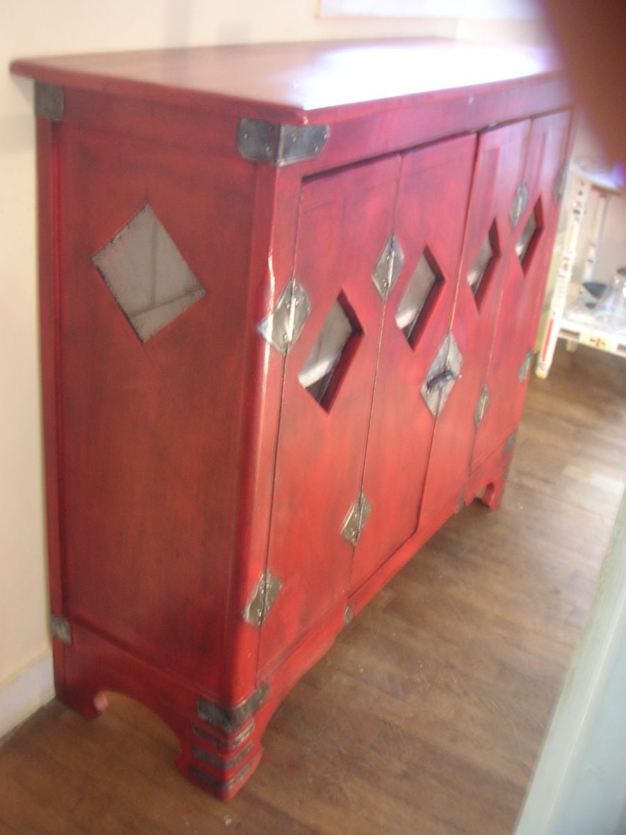 buffet vaisselier style tibétain est un meuble de grand rangement idéal dans un séjour - salle à manger ou cuisine. Avec ses lignes sa belle patine douces et élégantes, ce buffet en bois de coloris rouge s'intégrera facilement dans votre intérieur.équipé de 4 portes grillager et de deux étagères intérieur