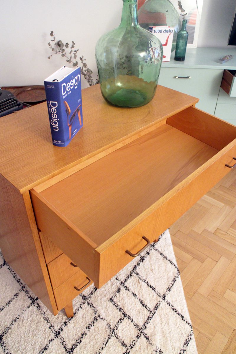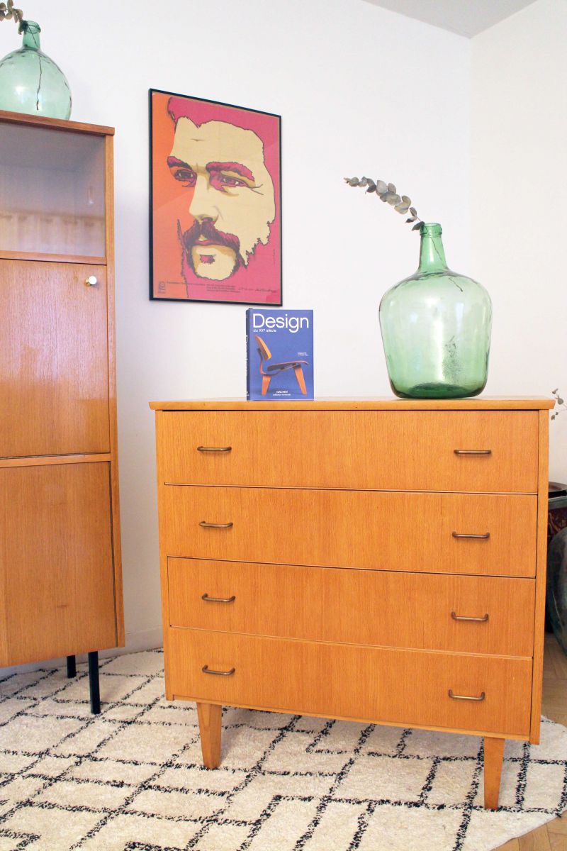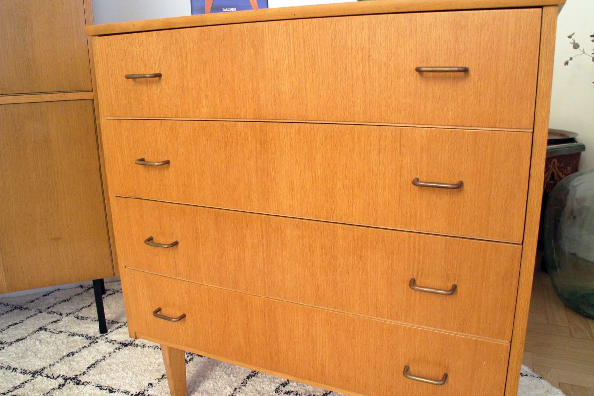 olie commode vintage à la couleur marron clair aux pieds fuselés et aux lignes scandinave.