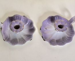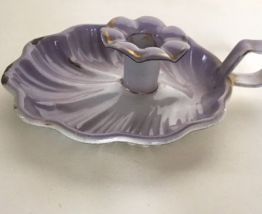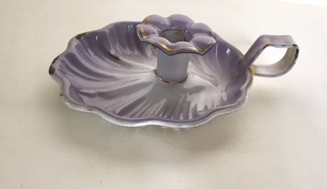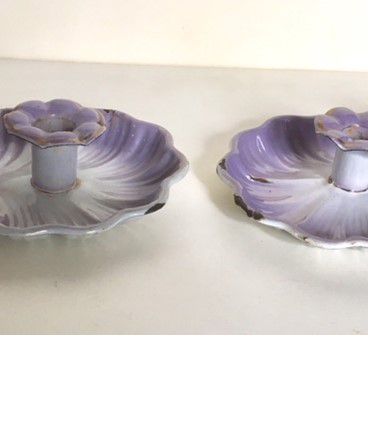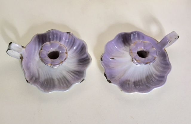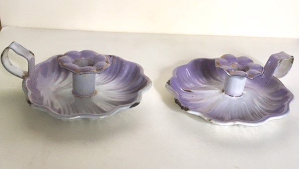Ravissante paire de bougeoirs en tôle émaillée mauve à filets dorés fin 19ème. Quelques éclats d'émail dus à leur âge... mais qui ajoutent à leur charme !