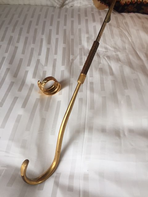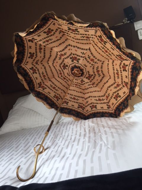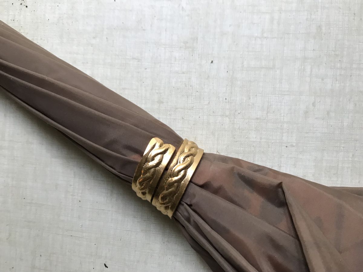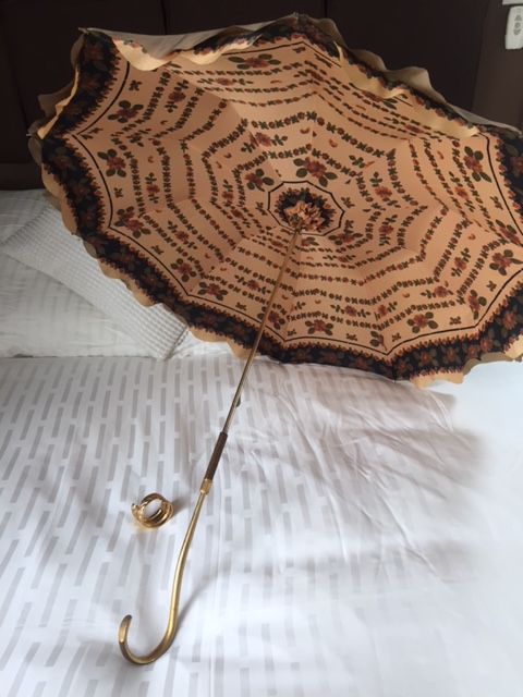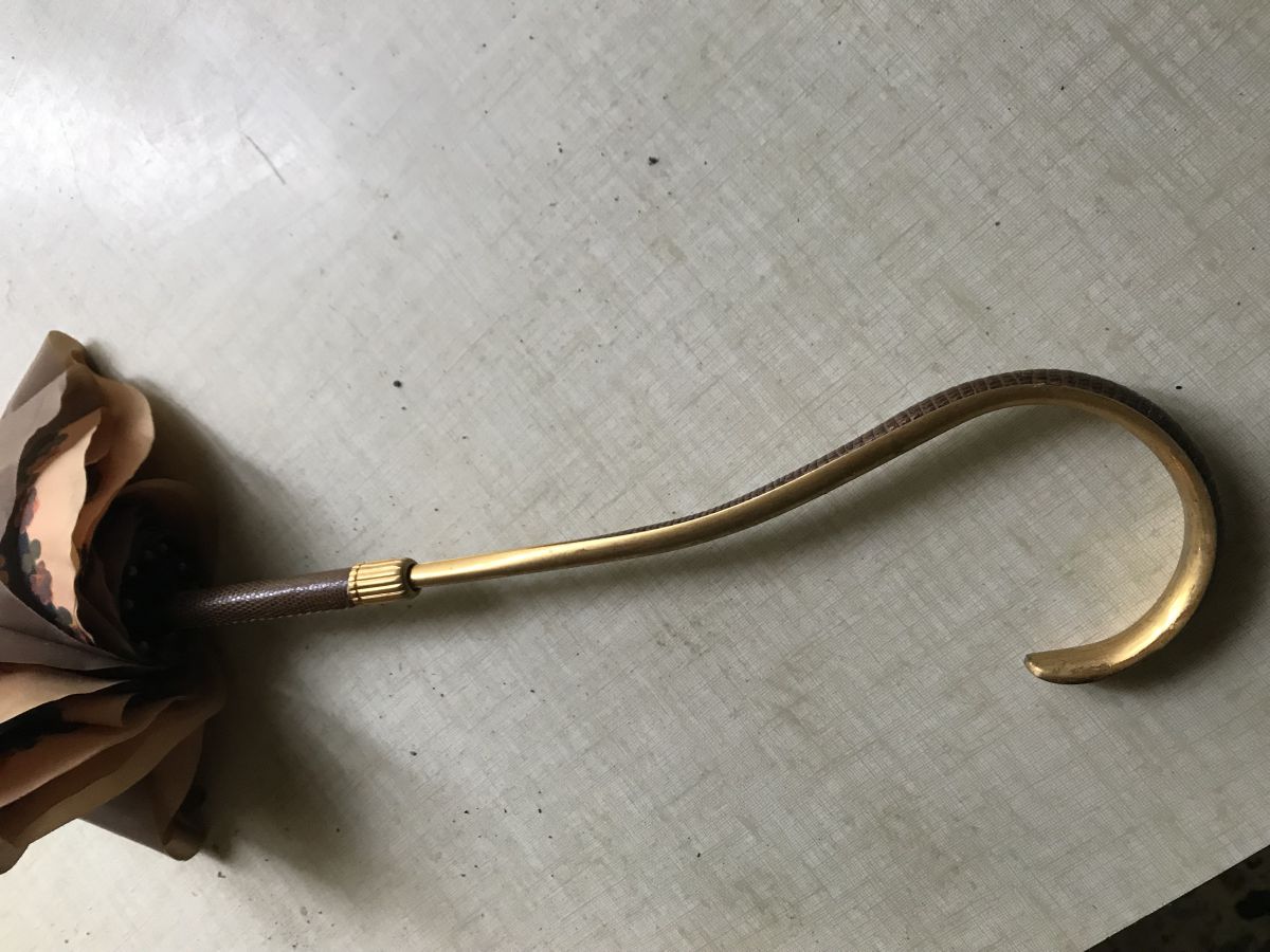 Ombrelle en bon état, manche en cuir et laiton , fragile et d'époque . anneau de serrage en laiton.