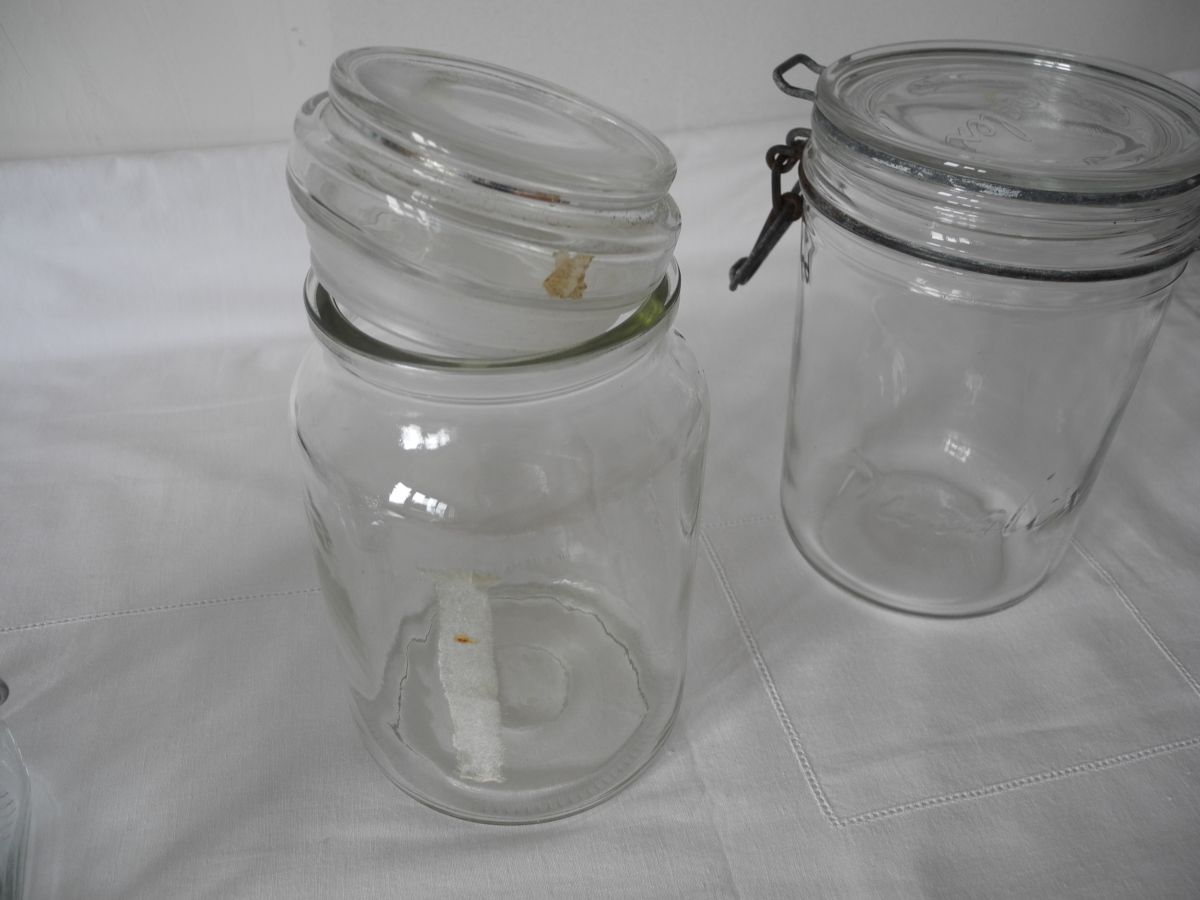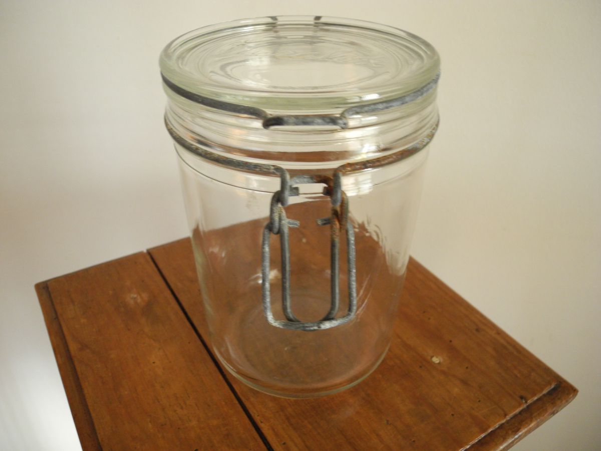 * 1 bocal ancien 1L Duralex, forme droite, métal un peu rouillé,