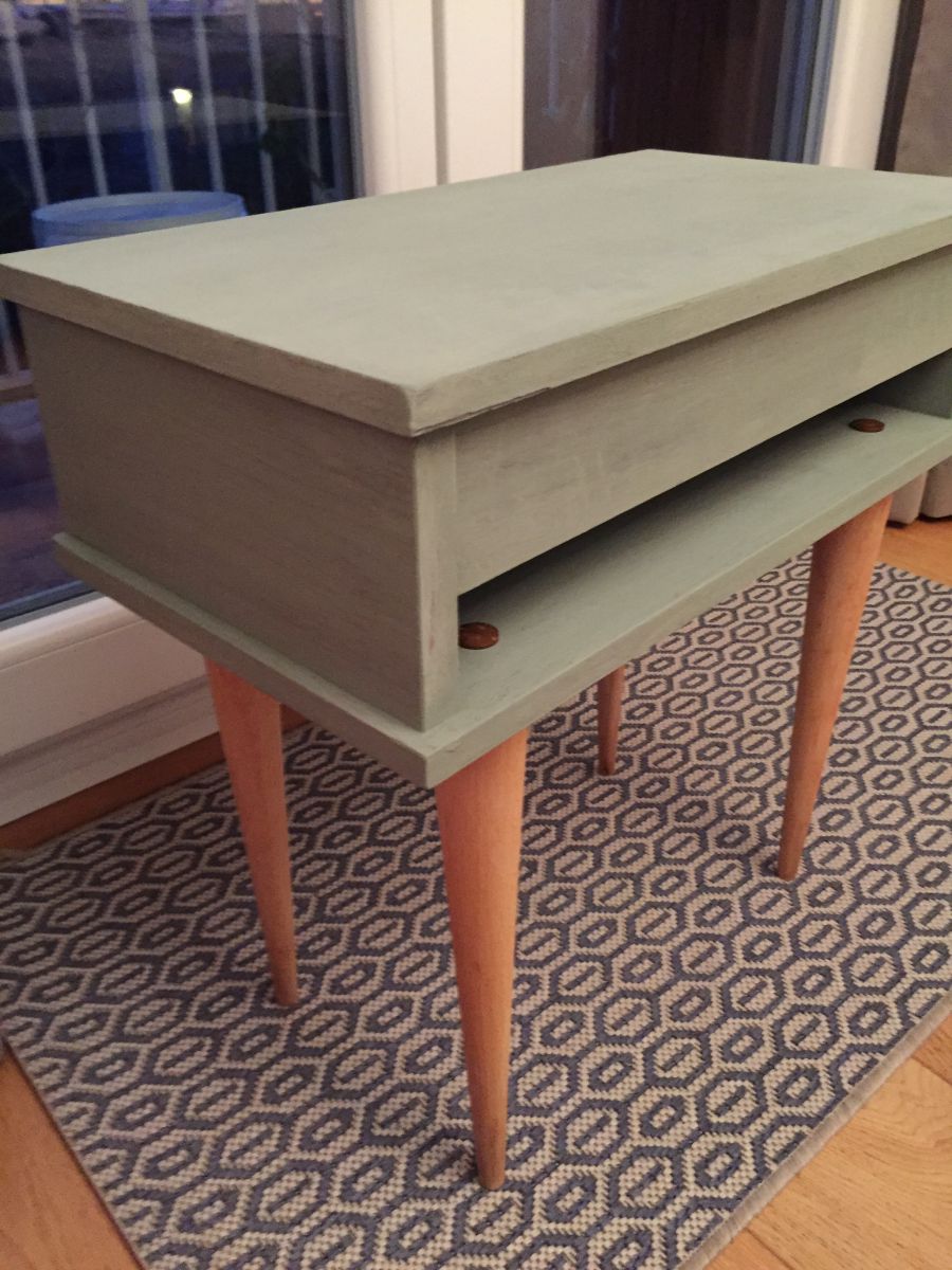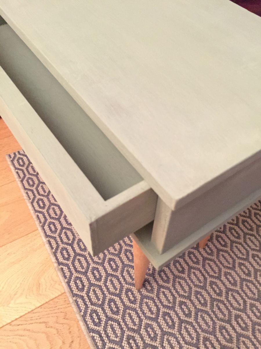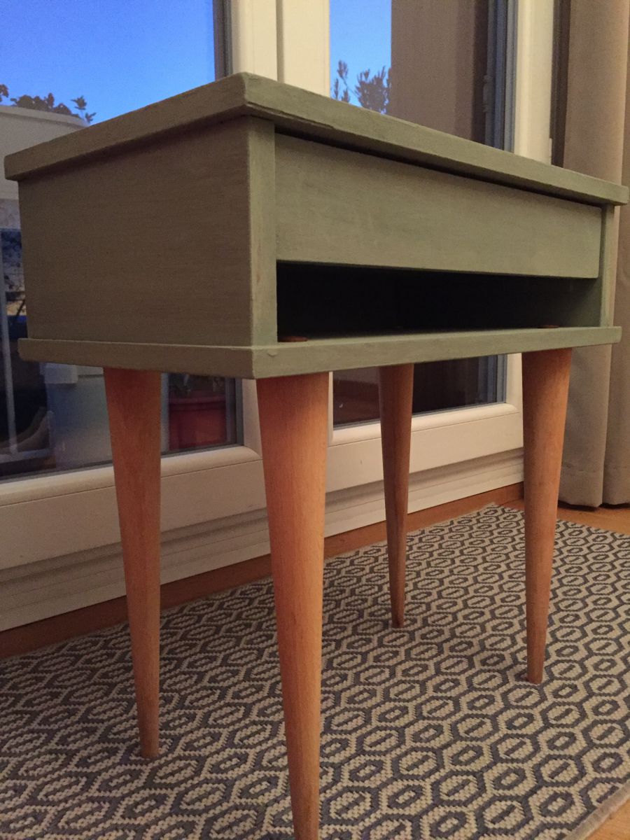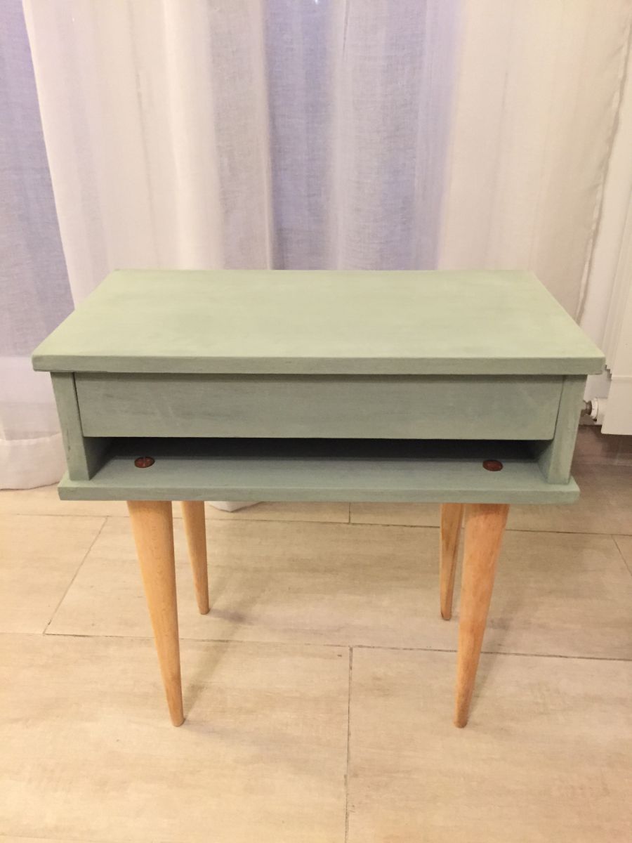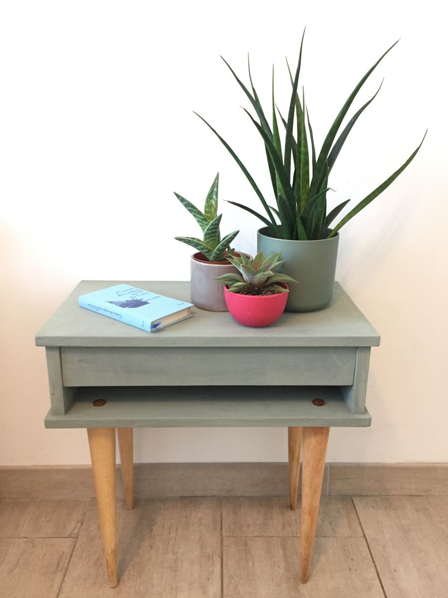Chevet vintage de couleur kaki clair mat avec pieds en bois naturel.