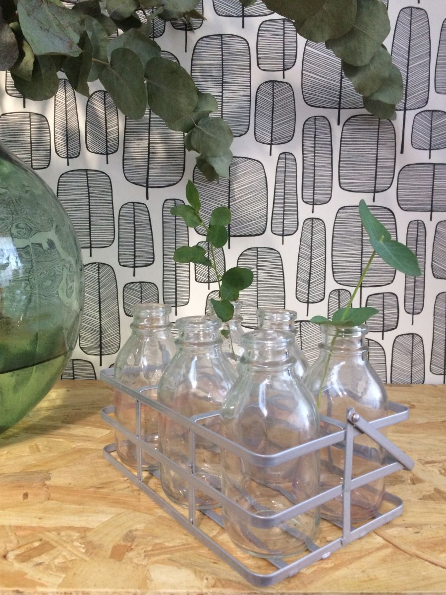 6 soliflores en verre présentés dans un petit porte bouteilles en métal avec une anse