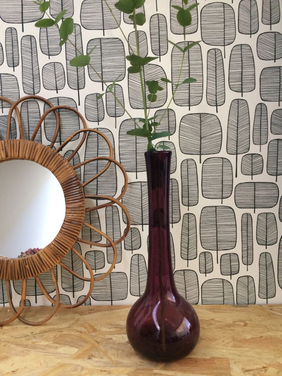 Vase de couleur prune en verre soufflé et bullé conçu dans la réputée verrerie de Biot, élégant et raffiné, au charme intemporel