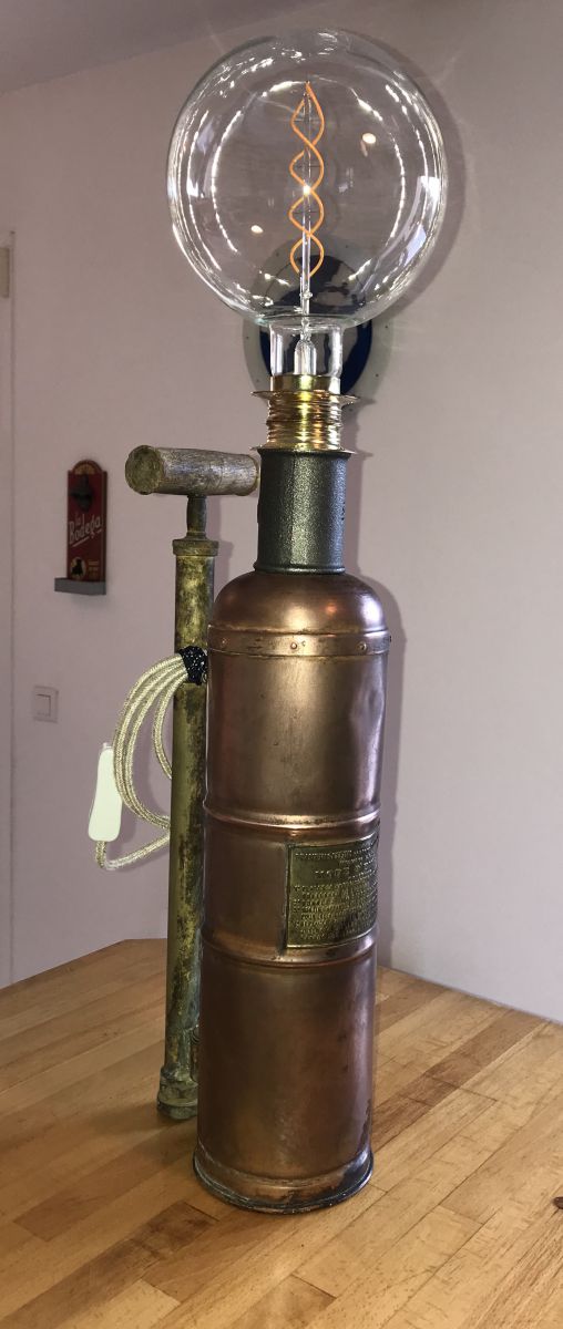 Pulvérisateur cuivre Muratori des années 1900 customisé en lampe. Mécanisme neuf. Ampoule LED filament type Edison à faible consommation A++.