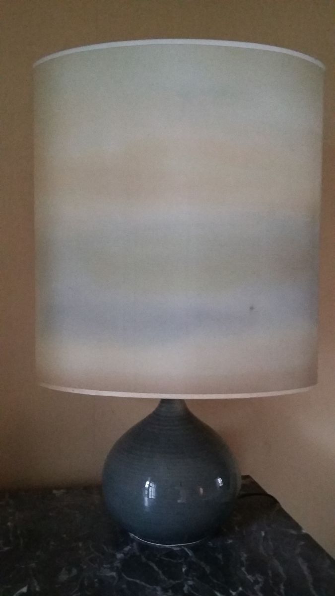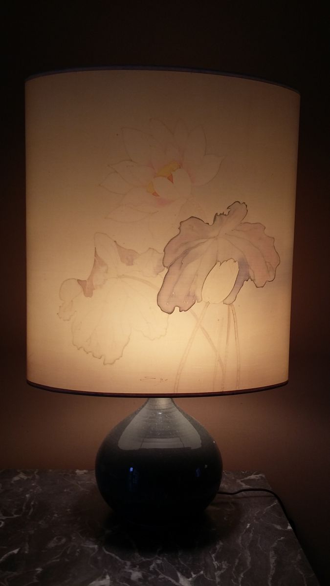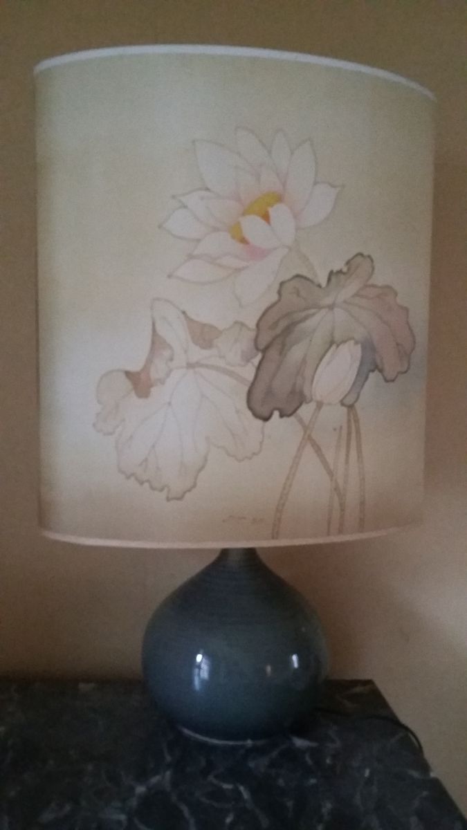 Lampe à pied rond en céramique avec abat jour en soie motif fleurs de nénuphar.