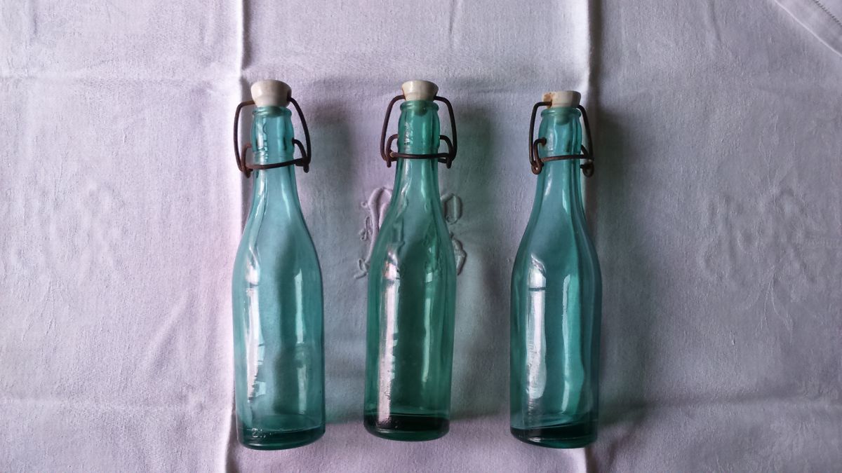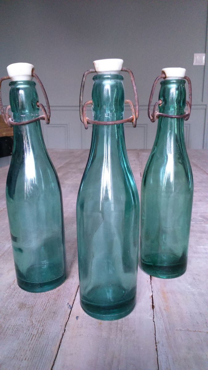 Adorables bouteilles de soda anciennes de 25 cl chacune en verre de couleur bleu turquoise. L'une est légèrement plus verte. Verre épais et bouchon en céramique. Pas de manque ou fêlures. Une bouteille pèse environ +400g