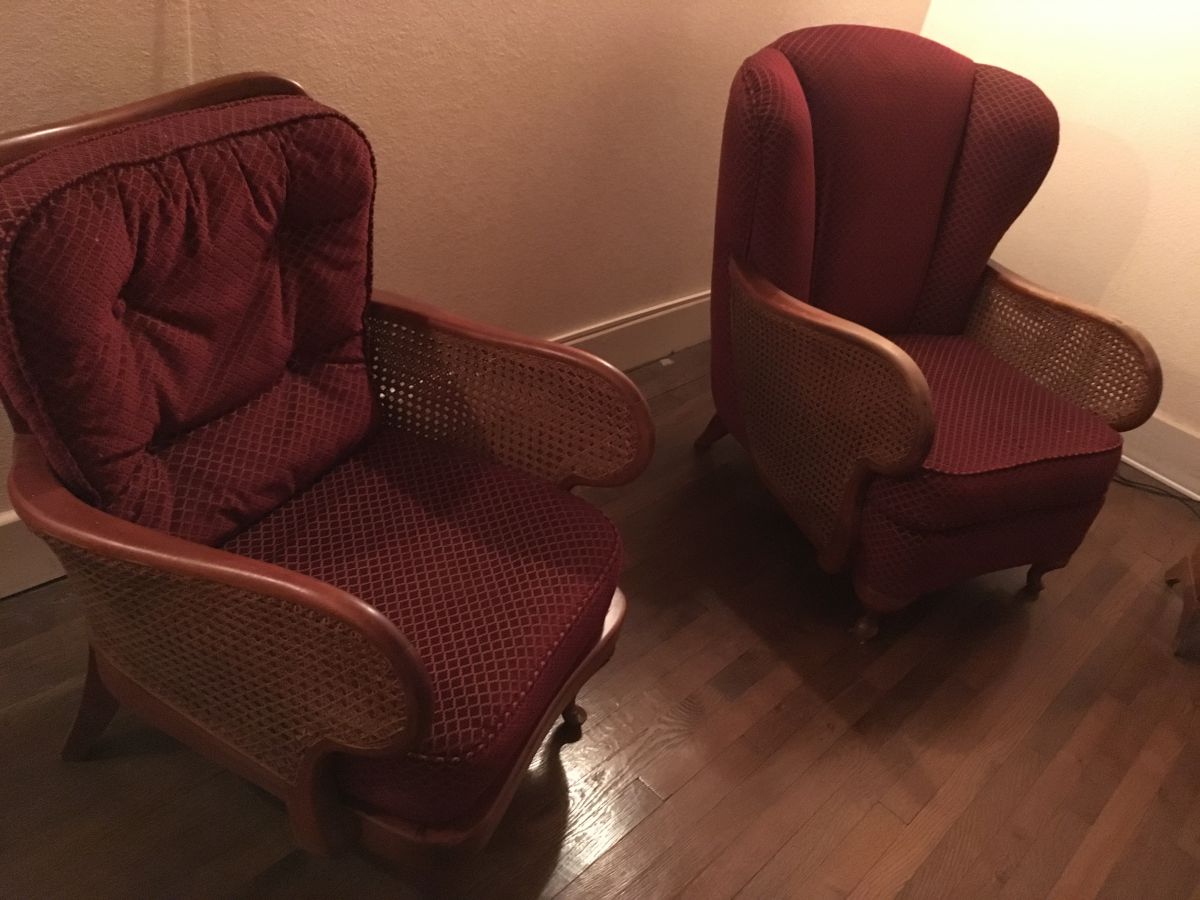 2 magnifiques bergères / fauteuils en velours bordeaux avec accoudoirs cannés .