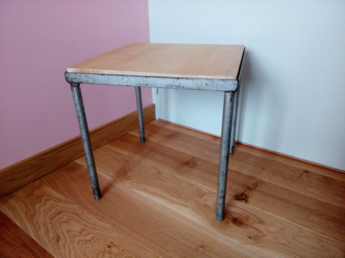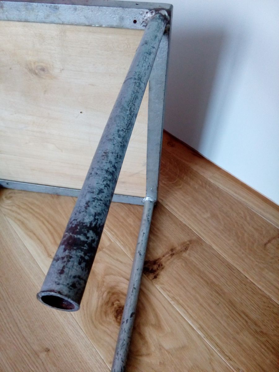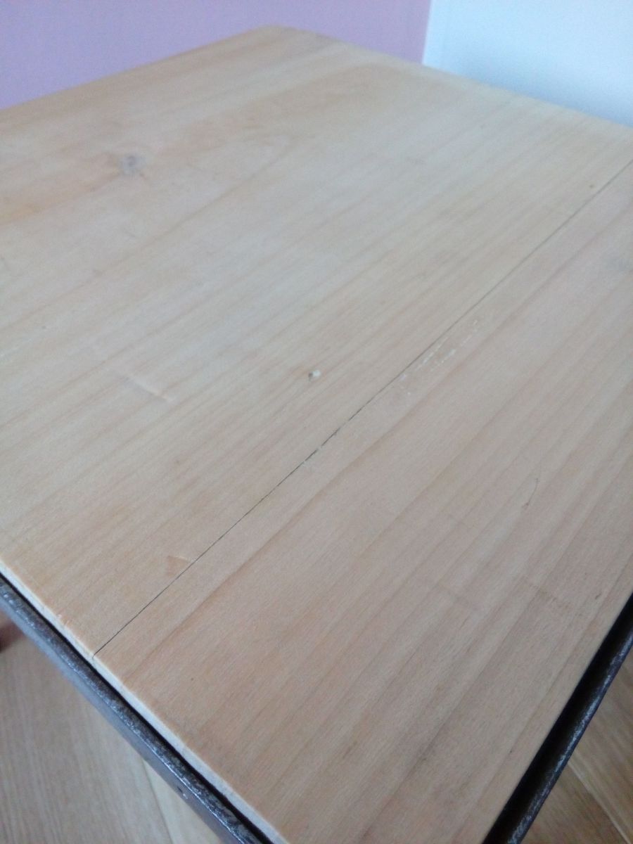 J'ai donc créé un nouveau plateau à partir d'une planche en bois massif brut (étagère d'une vieille armoire) que j'ai simplement cirée avec de la cire d'antiquaire incolore. Les défauts de cette planche ancienne vont bien avec le côté brut de la structure métallique.