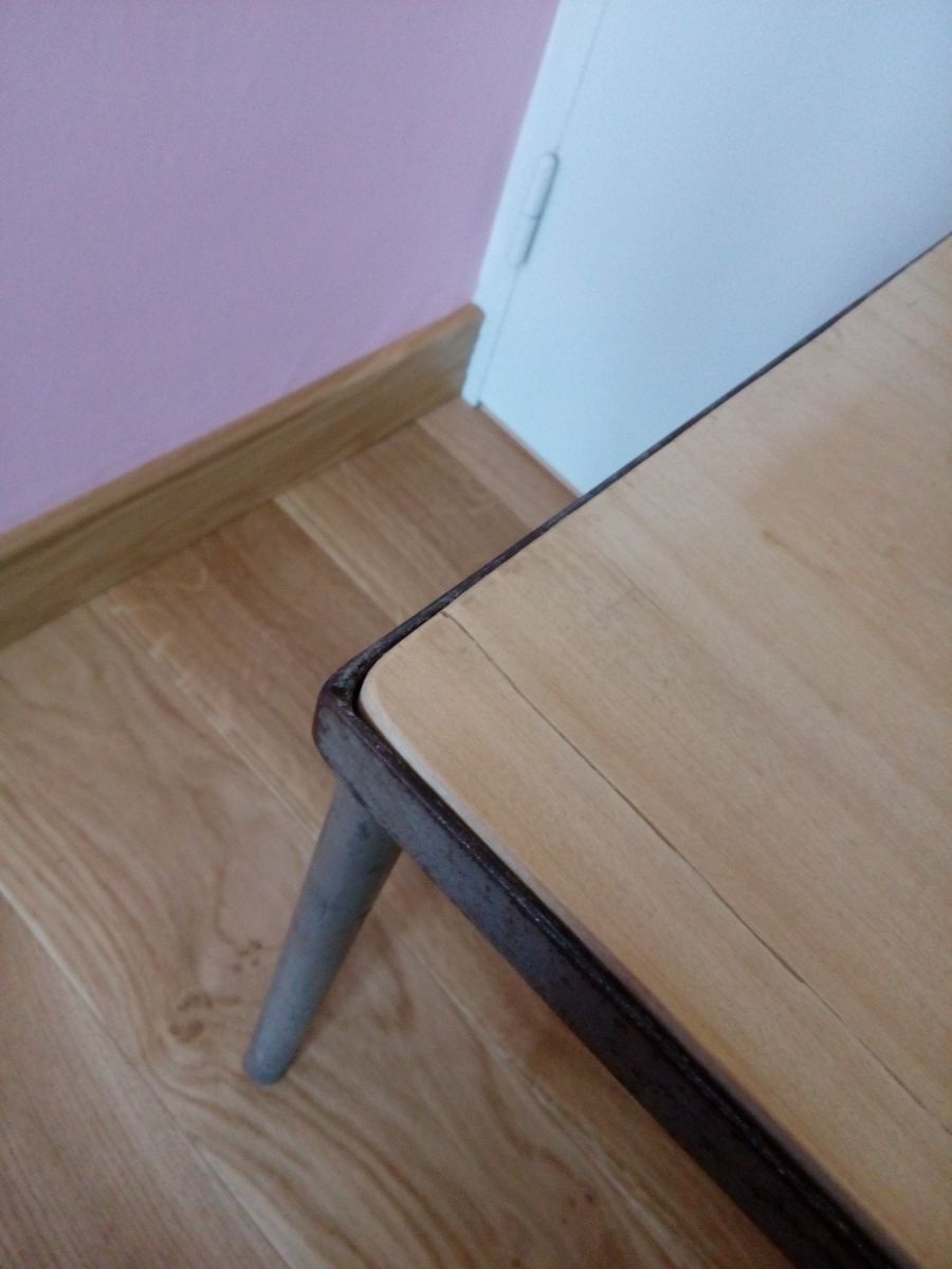 Lorsque je l'ai chinée, cette table ne comportait plus de plateau (qui devait être en formica probablement, car ce meuble a beaucoup de points communs avec une console que j'ai chiné en même temps et qui elle a toujours son plateau en formica... jaune!)