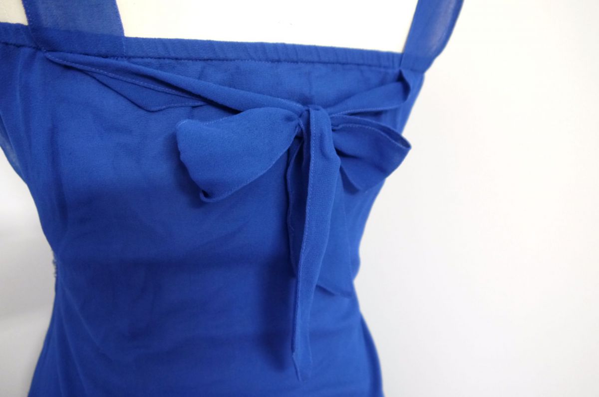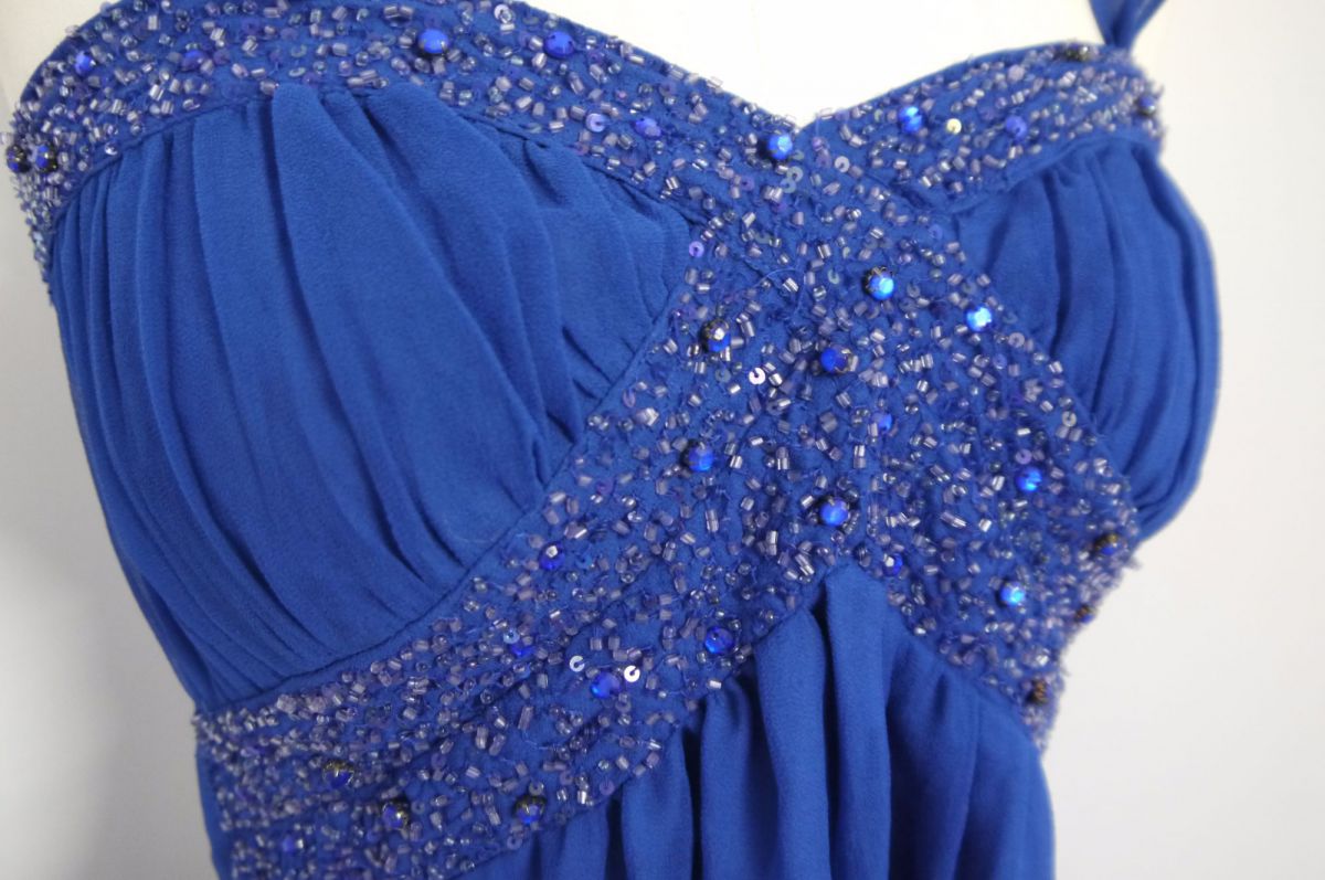 Magnifique robe fluide de couleur bleu électrique de la marque Morgan, col en coeur, joli décolleté avec des strass, matière fluide, doublée, petit noeud au dos à nouer, bretelles larges, forme évasée, zip latéral invisible. Idéal pour les fêtes ! Neuve jamais portée, taille 36.